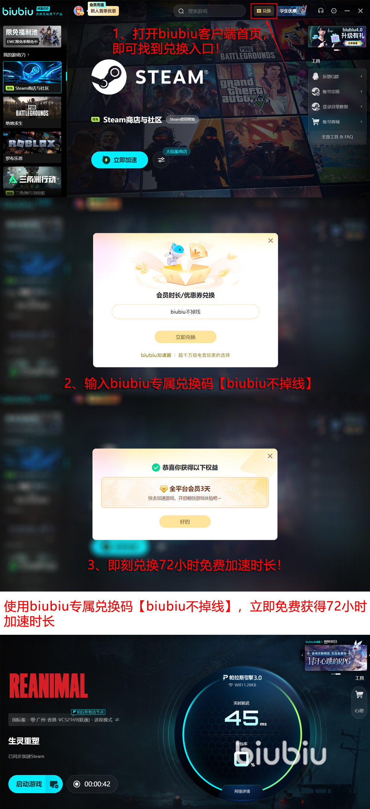 现在,大家可以用低成本来亲自体验它的效果,所有玩家只需在客户端输入口令【biubiu不掉线】就能直接领取72小时的免费加速福利。如果是刚刚注册的新用户,那么在登录成功后还会额外获取24小时的免费全平台加速时长,将这两项福利叠加,总共可以享受到长达96小时的免费加速服务。