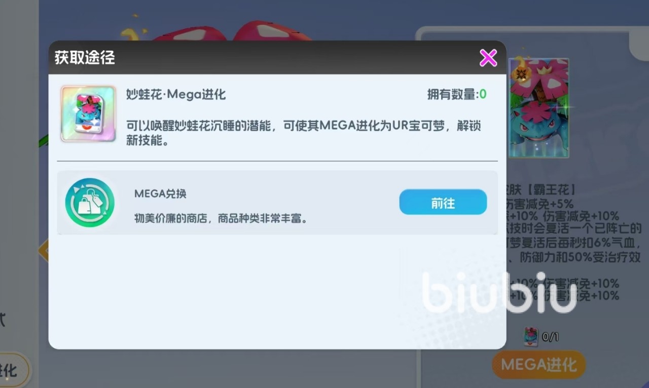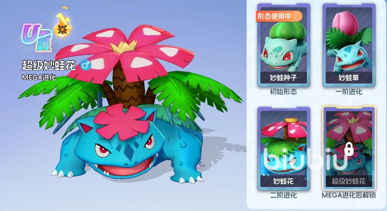 获取途径方面,超级妙蛙花属于UR品质宝可梦,需通过MEGA进化系统达成。玩家须先将妙蛙种子培养至满足MEGA进化条件的品阶等级,再于游戏内MEGA兑换界面获取对应进化卡。两项条件缺一不可。成功进化后,妙蛙种子将立即转变为超级妙蛙花形态,品质同步由SP跃升至UR。需注意的是,当前版本MEGA兑换功能暂未开放,建议玩家优先完成妙蛙种子的基础养成,待系统更新后即可快速完成形态转化。
