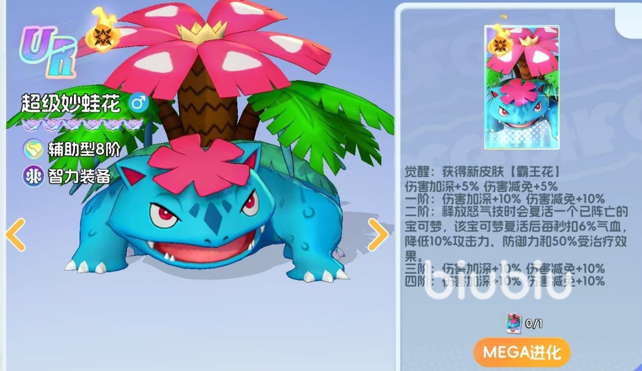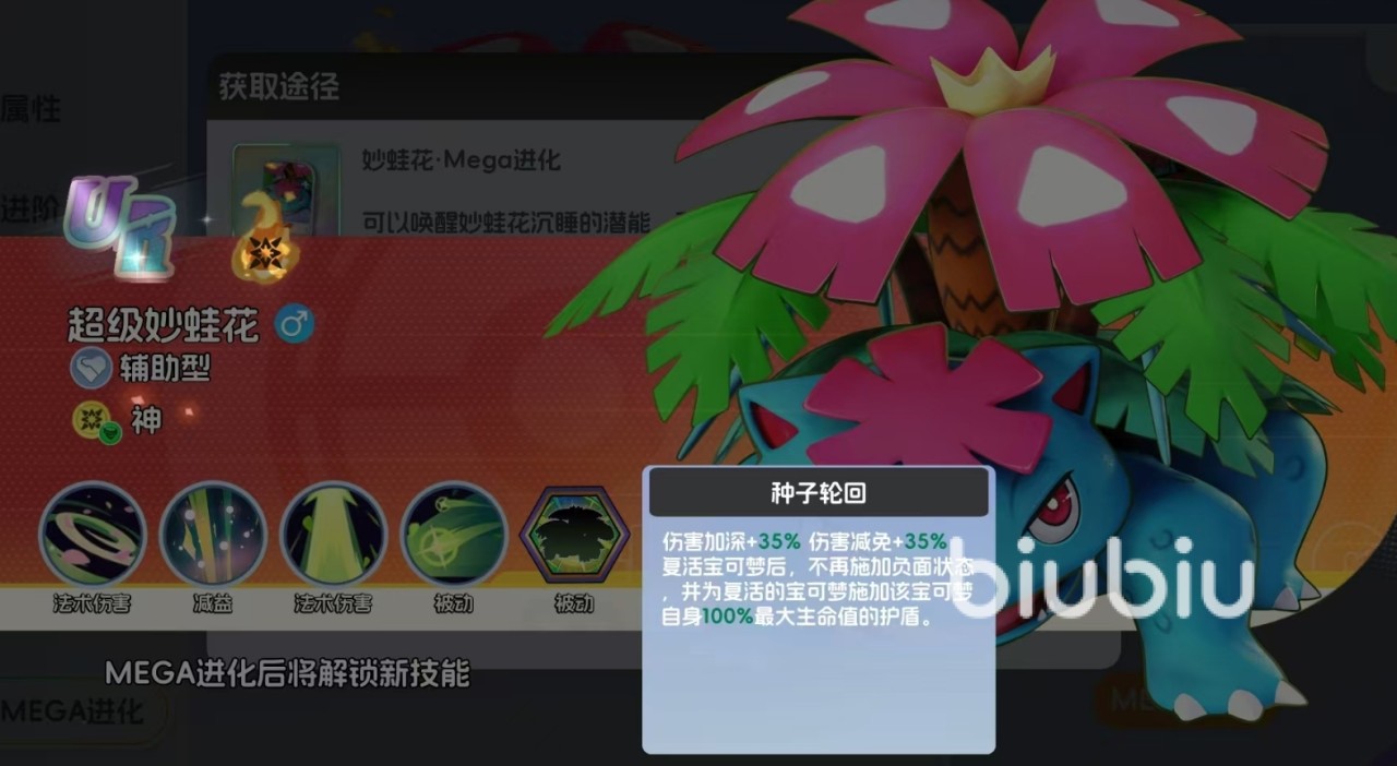 基础形态的妙蛙种子已具备双模辅助潜力:一方面可通过高量治疗技能持续维持前排生存;另一方面能释放稳定眩晕控制,有效打断敌方关键技能释放节奏。进入MEGA进化后,妙蛙种子升格为超级妙蛙花,并在完成二阶突破时解锁「群体复活」技能——该技能可令阵亡队友重返战场,虽附带每秒扣除6%最大生命值及攻击力降低的临时减益,但其战略价值远超负面代价,显著提升队伍容错率与持久作战能力。