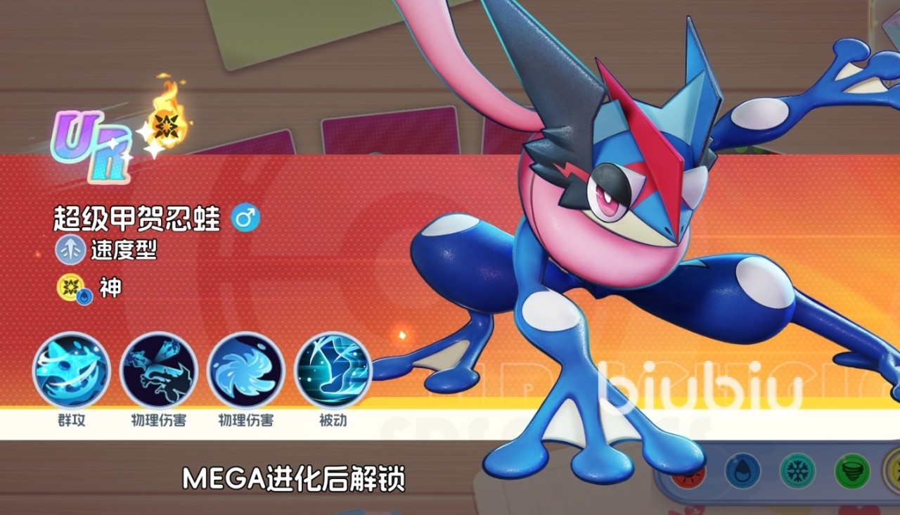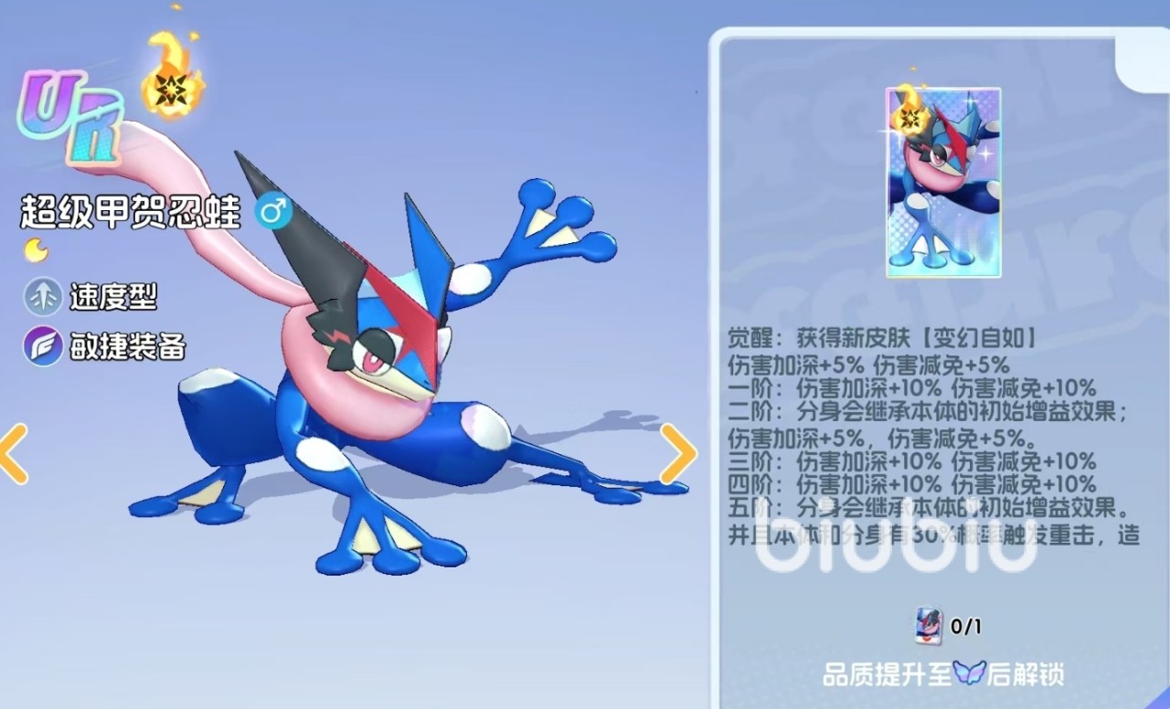 成功完成MEGA进化后,呱呱泡蛙将正式晋升为超级甲贺忍蛙(UR品质),同时解锁专属觉醒技能。该技能具备三重战术价值:一是提供基础增伤与伤害减免效果;二是在释放影分身时,使分身完整继承本体初始增益状态,显著提升协同输出效率;三是当MEGA进化等级突破至五阶时,本体与分身每次普攻均有概率触发200%攻击力的重击,并附加2秒眩晕控制;更值得注意的是,当本体施放终结技时,所有存活分身将同步释放同名技能(伤害为本体30%),形成多线爆发压制,极大强化整体战场覆盖率与持续压制能力。