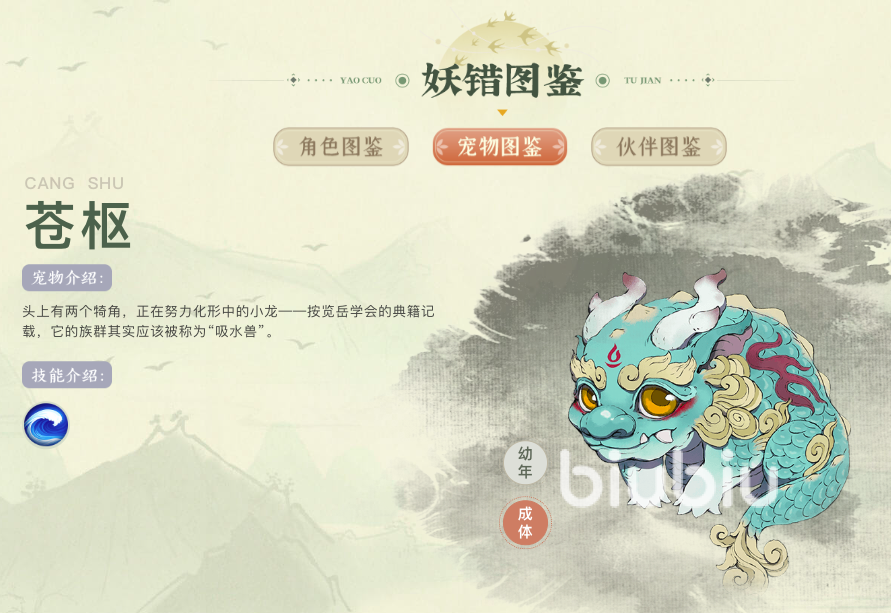 苍枢属水系成长型四足契灵,幼体具双犄,成年后可蜕变为龙形。古籍称其族为“吸水之兽”,技能“惊涛巨浪”契合其属性设定。幼体多栖息于湖泊沼泽地带,成体则迁移至近海区域。战斗风格偏重持续输出与战场控制,同时附带团队防御强化效果,属于攻守兼备型主力单位。