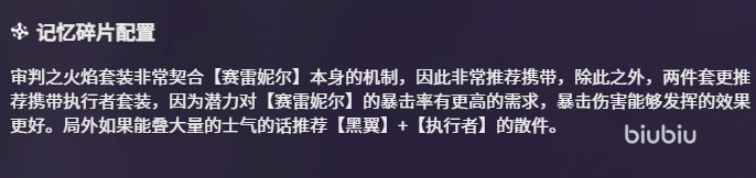 记忆碎片(即装备)配置是影响战力上限的关键环节。推荐优先选用“审判之火焰”四件套,其套装效果与赛雷妮尔的暴击流打法深度契合,能进一步放大暴击率与暴击伤害的乘区收益。剩余两件则建议选用“执行者”套装:该套装提供的潜力属性可直接提升暴击率,与审判之火焰形成双重叠加,使暴击稳定性得到质的增强,整体输出曲线更为平滑且峰值更高。