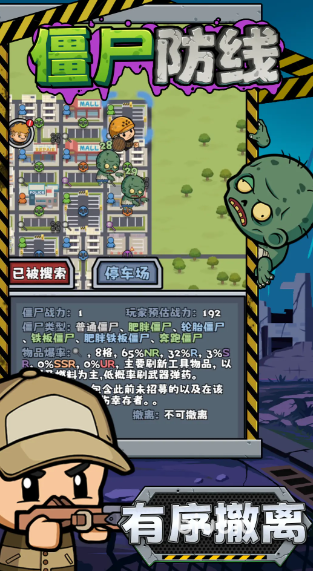 游戏以“闭环式生存循环”为核心机制:从基地出发→小队进入停车场搜寻物资→遭遇丧尸触发即时塔防布阵→完成目标后驾驶载具撤离→返回基地升级并筹备下一次行动。整个流程环环相扣,无冗余环节。木板用于构筑动态路障,食物维持幸存者体力与战斗持续性,而不同属性的僵尸——如普通感染者与高血量肥胖铁板僵尸——则要求玩家实时调整武器站位与角色技能组合。
