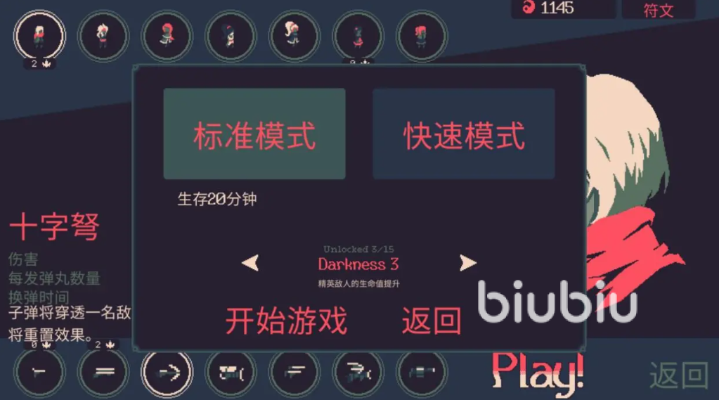 双模式结构是本作策略纵深的关键支撑:标准模式提供完整20分钟发育周期,适合依赖后期成型、高爆发或连锁清场能力的流派;快速模式则压缩至10分钟,更倾向前期压制力强、启动快但成长曲线平缓的武器组合。玩家需根据所选武器特性主动匹配模式,实现玩法与机制的高度统一。