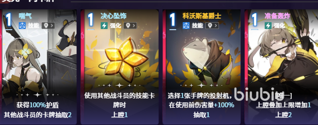进入中期,强化类卡牌开始发挥主导作用。「准备发射」是唯一具备开战触发机制的强化卡,首次行动后即生成1张投射机,并在之后每回合持续生成1张,形成稳定的投射资源池。而「决心坠饰」则强化了协同作战能力——每当友方角色使用技能卡时,该卡可立即完成上膛,大幅提升联动响应速度,尤其适配多角色协作阵容,既增强叠层上限,也为终局爆发积累优势。