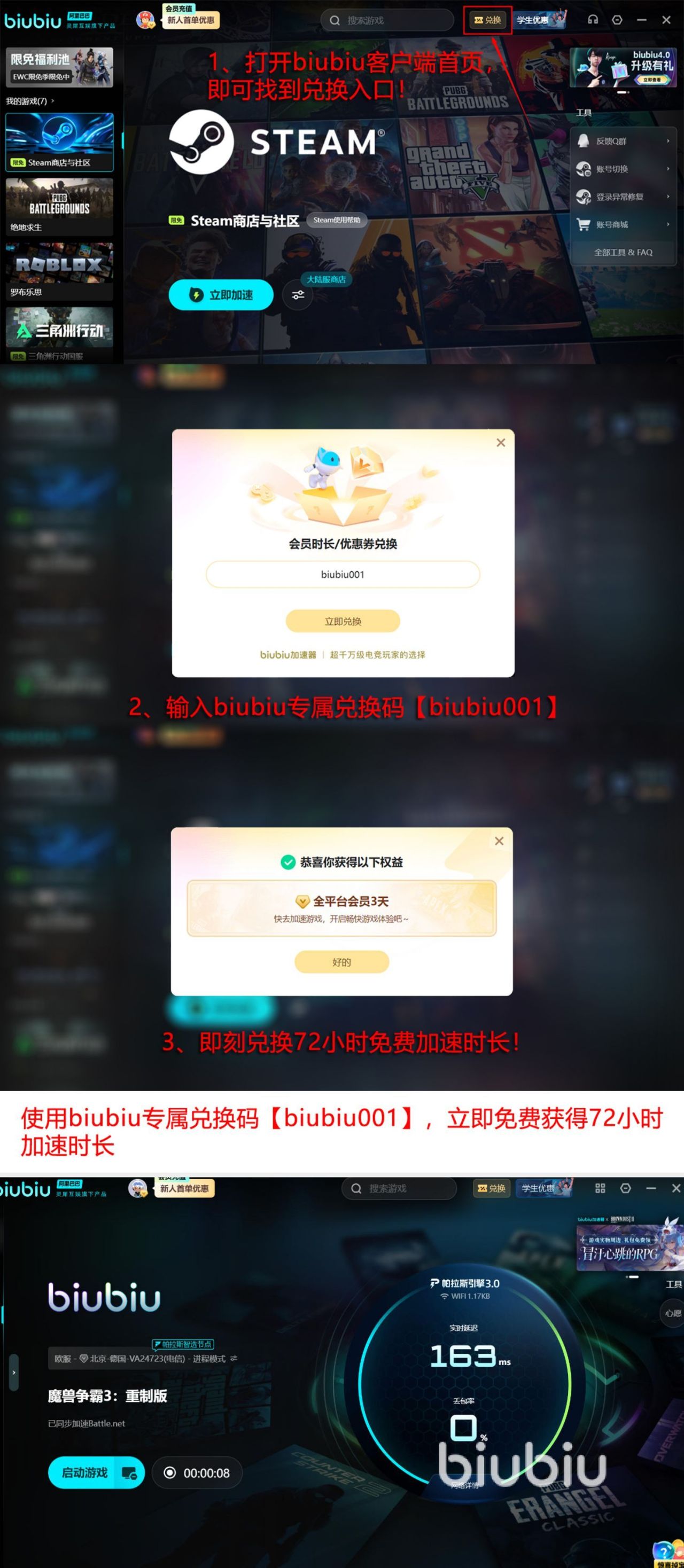 目前所有用户均可零门槛免费试用。新老用户输入兑换码【biubiu001】至主界面兑换板块,即可激活三天免费加速权益;新注册用户还可额外领取24小时新手体验时长。两项叠加后,新用户最高可累计获得96小时全功能加速服务,覆盖全部支持游戏列表。