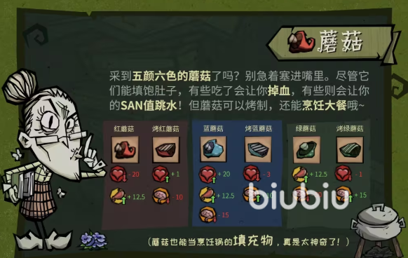 彩色蘑菇随机分布于阴湿洞穴口、腐叶堆附近,包含红、蓝、紫、绿四类。生食风险极高:红色蘑菇导致10点持续掉血(3秒),蓝色蘑菇引发眩晕(2秒无法行动),紫色蘑菇降低移动速度50%(持续5秒)。但所有种类经篝火充分烘烤后,毒性完全消除,统一转化为可恢复30点生命值、40点饱腹度的安全食品,是洞穴探索阶段的重要补给来源。