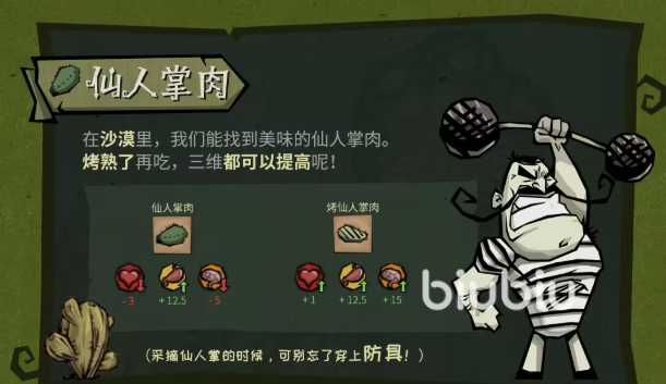 沙漠地带特有的仙人掌肉需使用镐类工具采集,未穿戴皮甲或以上等级防具时,每次采集将承受5点伤害。生食具有-15点生命值惩罚,不可直接食用;烤制后则转变为优质食材,可恢复50点生命值、60点饱腹度,并附加30秒耐热抗性(减免沙漠环境持续掉血效果),是高温区域生存的核心物资。