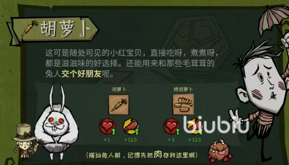 胡萝卜是地图中刷新频率极高、分布广泛的初级食物。其采集无需工具,徒手即可获取。生食可恢复20点生命值并提供30点饱腹度,虽数值不高,但胜在易得稳定。值得注意的是,胡萝卜是与兔人族群互动的关键道具——赠送胡萝卜可提升友好度,但若玩家携带生肉或熟肉靠近,将触发敌对反应,导致关系破裂。