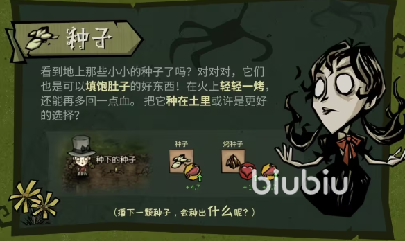地面散落的种子(常见于草丛与泥土裸露区)是极易被忽视的生存资源。生食可提供25点饱腹度;烤制后生命恢复量达25点,饱腹度提升至45点;而将其播种于耕地区域,经4个昼夜周期可收获成熟作物(如小麦、土豆),实现食物产能的自主化,为中后期储备奠定基础。