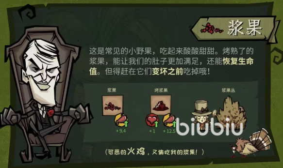 浆果丛呈簇状生长于林地、草原等开阔区域,采摘效率高,单次可获得3–5颗。生食仅恢复15点生命值且饱腹度为20点;经篝火烤制后,生命恢复提升至35点,饱腹度增至40点,并额外赋予5秒微弱护甲加成(减伤10%),适用于突发战斗后的快速回血。需注意:浆果保质期仅3分钟(游戏内时间),且易被游荡的火鸡主动拾取并消耗,建议随采随用或就近烹饪。