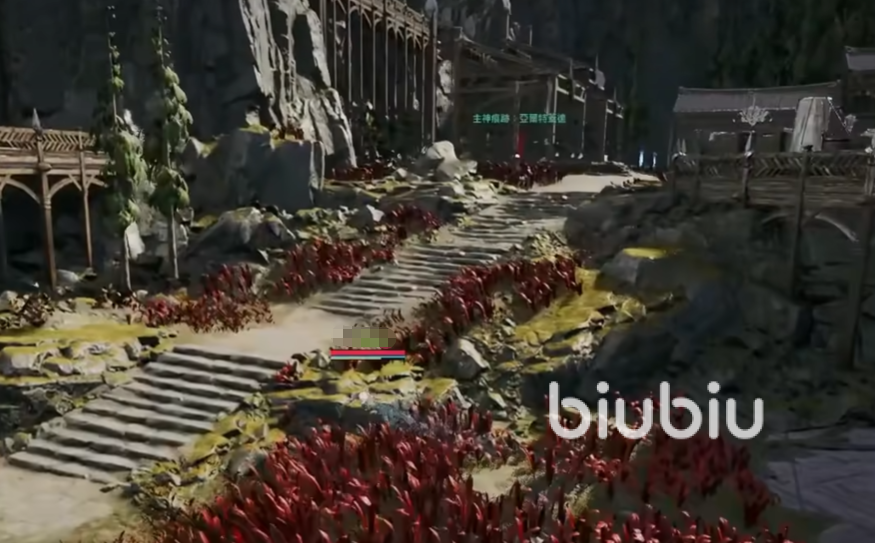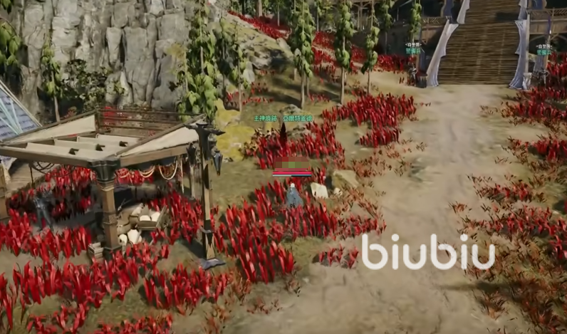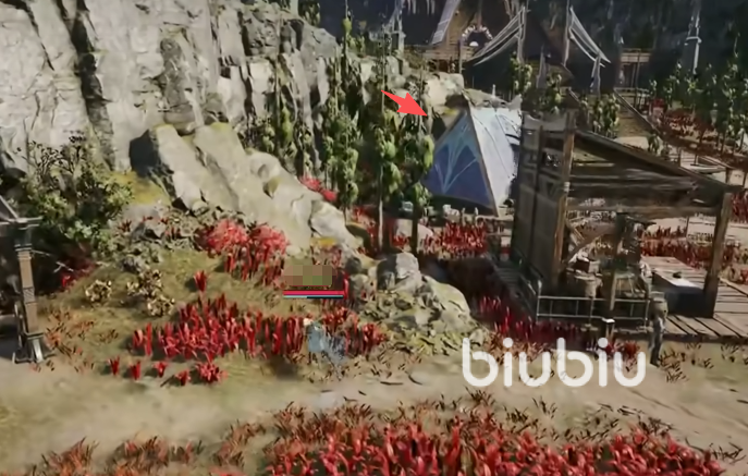 5、往右走,会看到一个类似于小市场的居民聚集处,开启翅膀飞上去,能在山崖上红色花丛中找到一个。