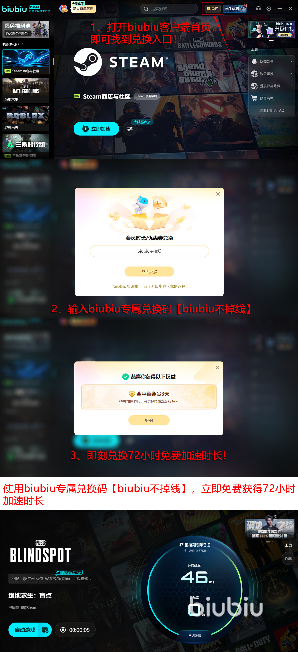 反正优惠都给出来了,不用就亏了,来注册账号吧,新用户轻松获取24h免费服务时间的,再来参与兑换活动,拿上【biubiu不掉线】的人又能换到72h额外服务时间的,叠加可使用的新人权益足足有96小时,可不能错过了。