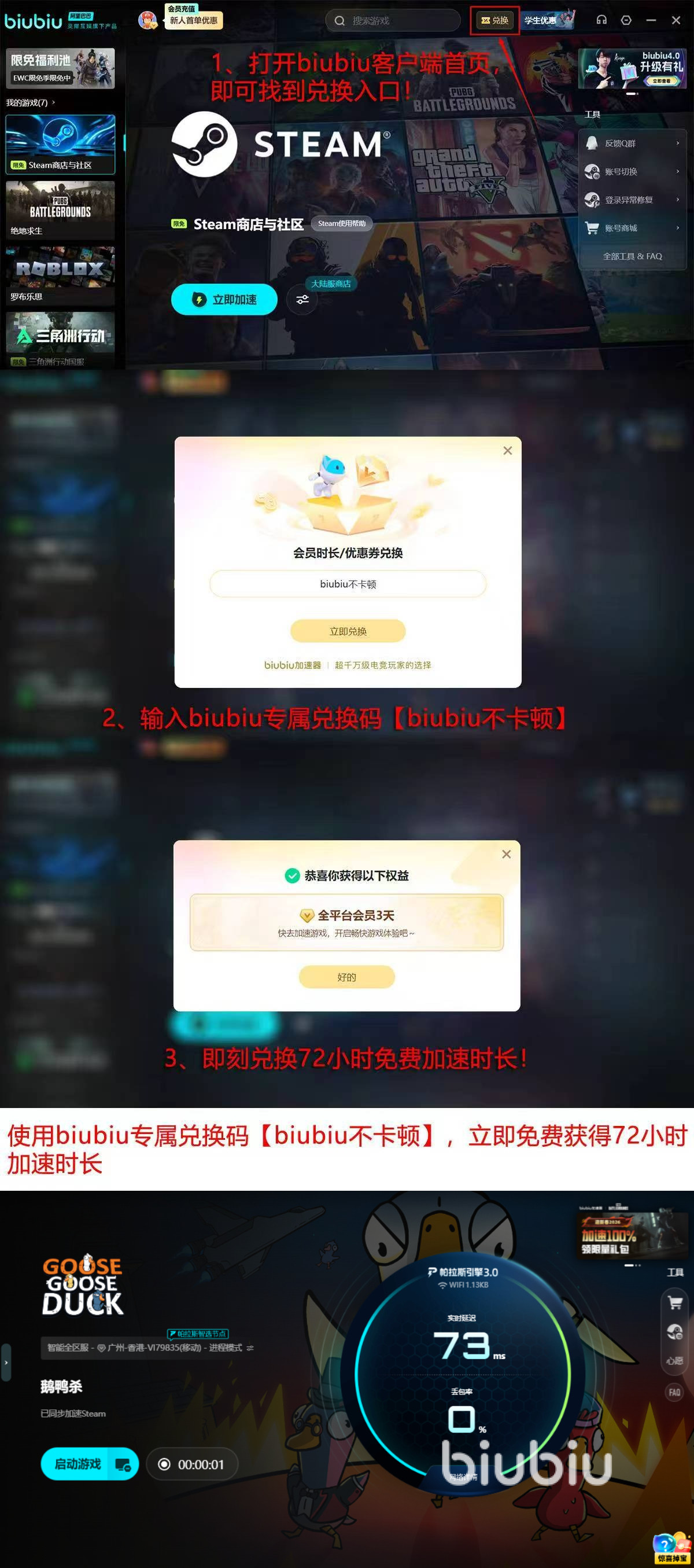 目前新注册用户会自动获得首日24小时全功能试用权限,输入【biubiu不卡顿】即可再获得72小时加速福利,累计下来最多可以获得96小时的加速体验。以上两项福利活动不能叠加使用,可自由选择其一参加。