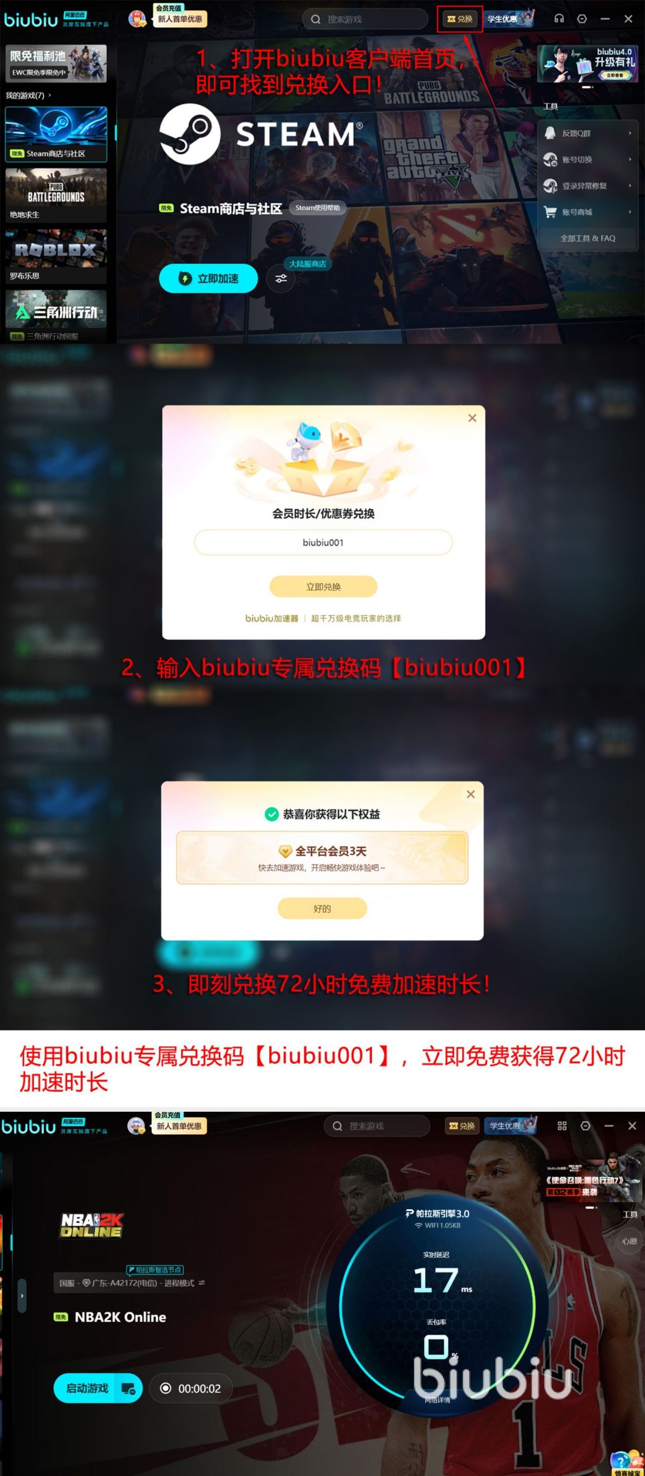 此加速器的实力真的是响当当,也是要求比较严格的赛事专属,经过高科的赛事验证,还提供了丰富的福利,新老玩家都可以输入相同的指令,那就是【biubiu001】,直接解锁三天的免费加速时长,其次,对于新用户也有一种特别直接的服务体系,那就是成功注册后就可获得24小时免费时长。这两种方式累积下来都可以达到96小时,都可以同时使用,这已经将免费的加速时长直接拉长。