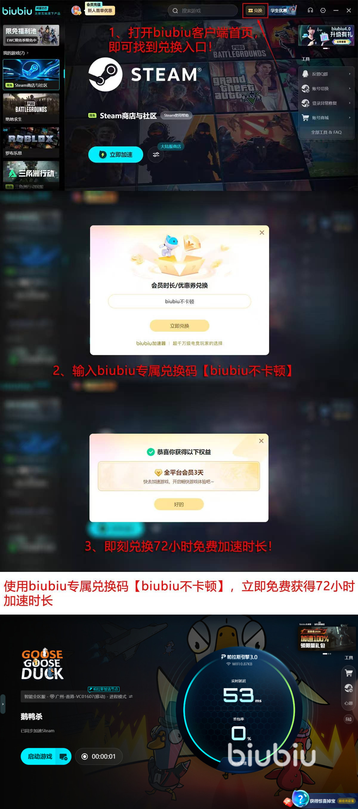 对于新用户注册玩家可以自动获得首日24小时全功能免费试用权限,输入【biubiu不卡顿】可以再立刻解锁72小时加速时长,新用户叠加福利,最高可以畅享总计4天的免费加速体验。两项福利只能选择一项领取,请根据自己的需要选择。