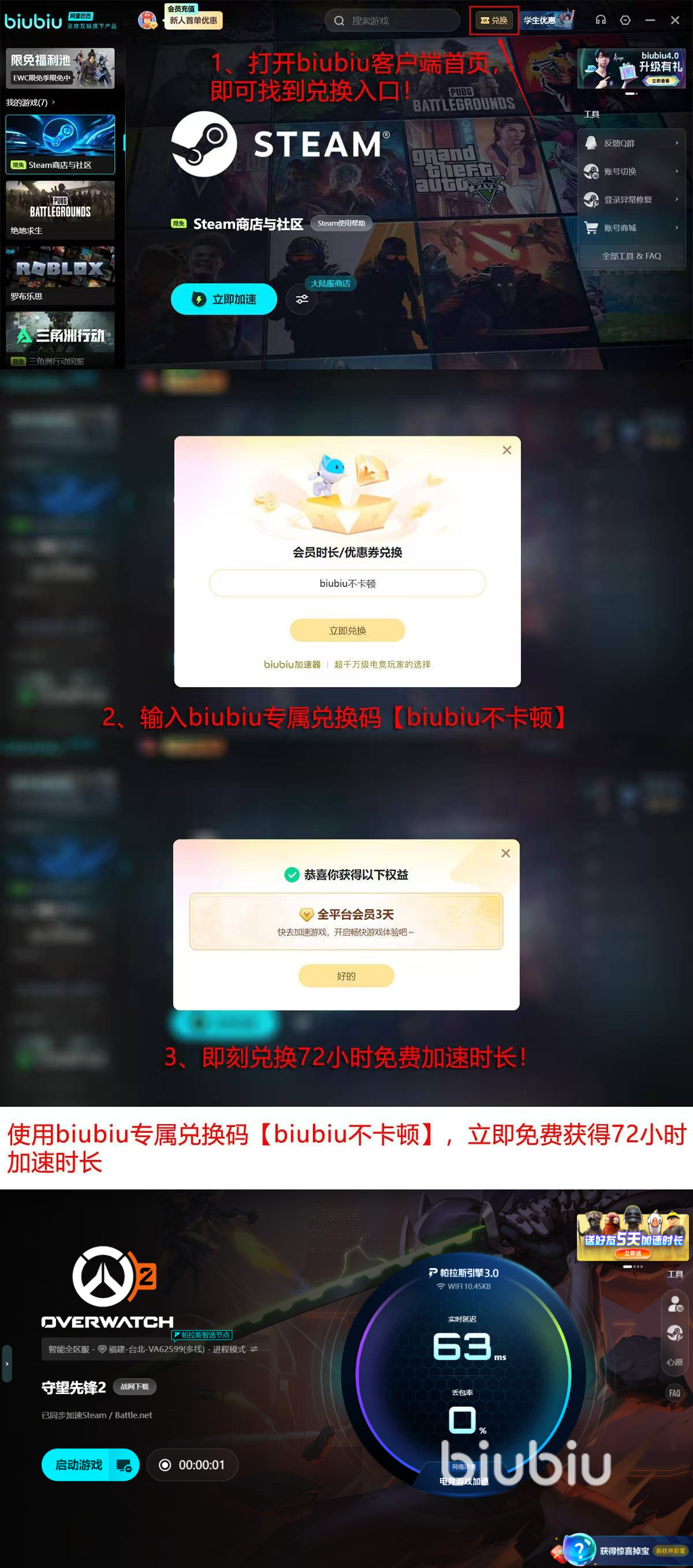 新用户注册Biubiu加速器,可以获得24小时全功能试用机会,输入【biubiu不卡顿】再激活72小时加速时长,累计畅享96小时优质加速服务,体验网络优化的乐趣。