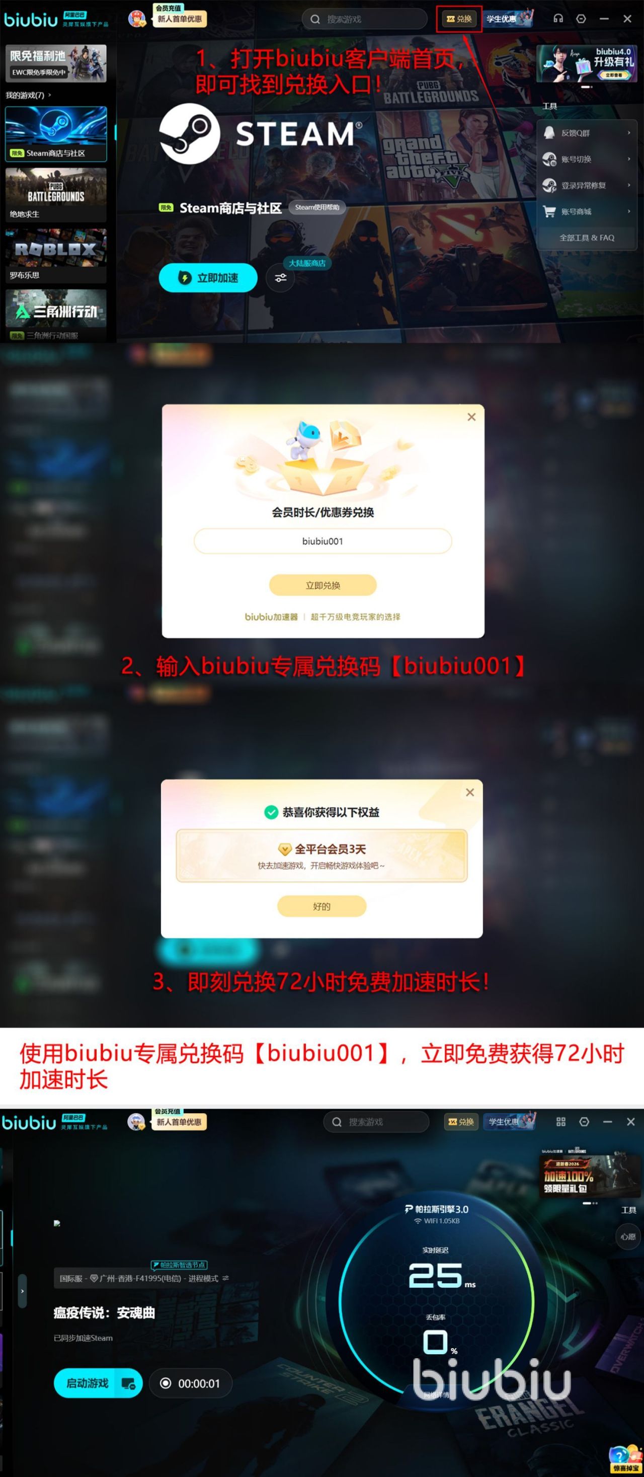 在各种技术的加持之下,在很多高电竞的场景中也得到了验证,Pubg冠军左梓轩已经为其代言。其实众多游戏都会遇到网络堵塞等一系列的问题,那么此工具却可以完美地规避。除了这些优势以外,也携带着重大的福利重磅来袭,当我们第1次激活的时候就可拥有24小时的加速时长,等到全部使用完之后就可利用【biubiu001】,拥有三天的加速时长,那么这样算下来一共就合计达到96小时。