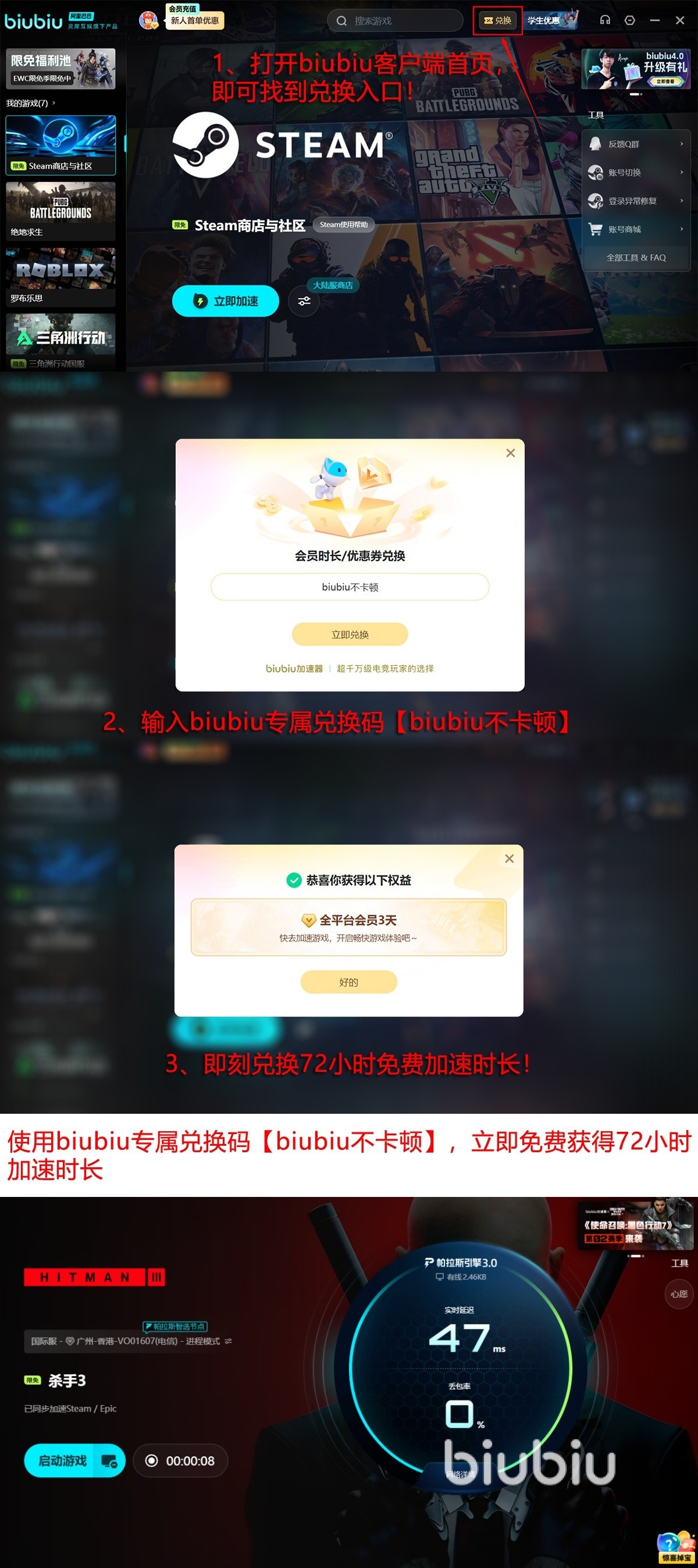 现在市场上加速器的选择特别很多,但有的“小作坊”连自己的官网都没有,biubiu是作为阿里巴巴灵犀互娱大厂技术加持的,所以它的更新、技术都有很强硬的保障,在福利上也是毫不吝啬!新用户首次来注册能领取到24小时免费加速体验,后面的新老用户输入兑换码【biubiu不卡顿】再领取72小时的时长,两者加在一起足足能提供96小时的免费时长,能让你对此加速器有一个全面的了解和深度体验。
