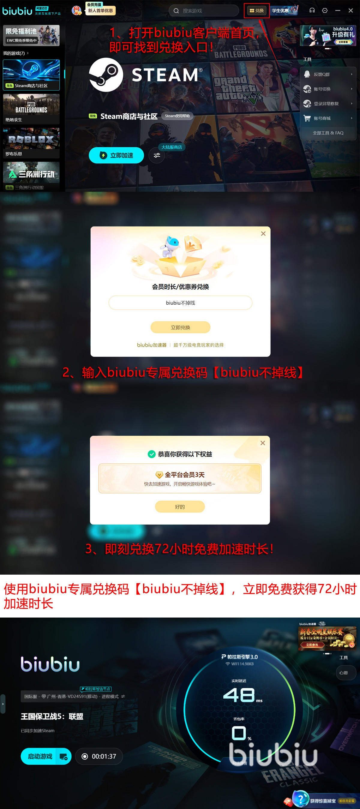 目前新用户注册即可激活首日24小时全功能免费加速,输入【biubiu不掉线】立即领取额外72小时,双重新人礼叠加,总共获得4天的顶级加速体验。
