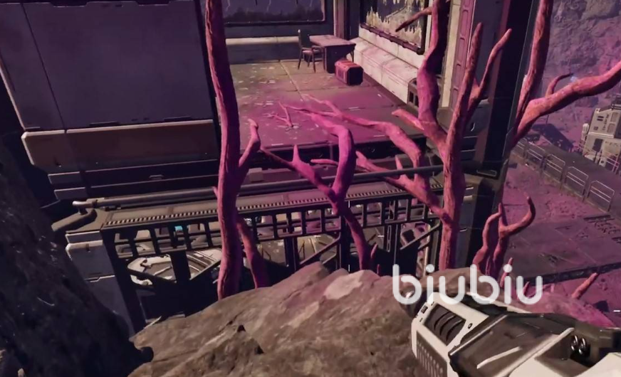 来到该建筑物附近,可以看到旁边有黄色的岩石山,这里需要大家从下图所示区域攀爬上高峰,这个路线会更简单一点。爬到差不多2层的位置,找到有泛着红光,类似于巨型树枝状的物体,从这里进入破败的建筑物当中。