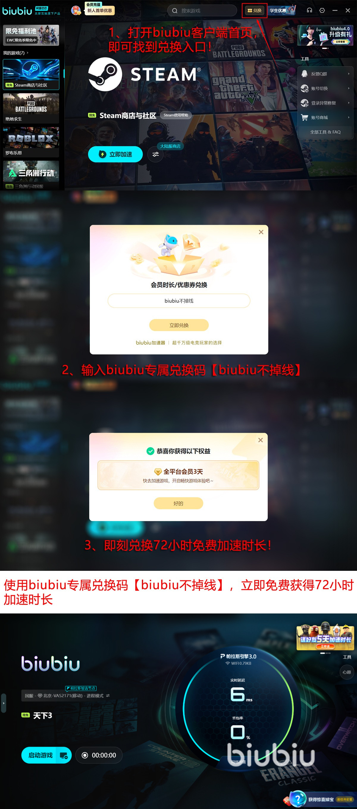 biubiu加速器给新玩家提供丰厚的礼遇,注册之后首日24小时全功能免费试用,输入【biubiu不掉线】激活额外72小时加速时长,这样算下来总共畅享96小时,这个福利让你无忧体验天下3的流畅世界,彻底摆脱掉线烦恼。
