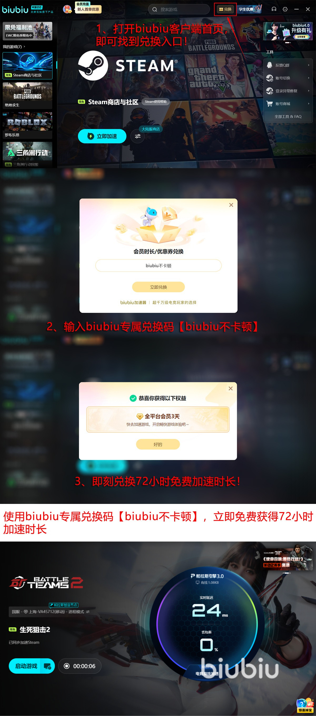 既然是射击游戏,肯定也要站在专业的角度去对待,而再好的加速器最终也是服务于玩家,所以biubiu加速器还邀请了绝地求生世界冠军XDD进行代言,除了让平台有了更高的权威性之外,平台还谋取了特别多的福利放送给大家,就比如新用户第一次来注册就能领取24小时的免费加速,体验不过瘾的新老用户还能输入兑换码【biubiu不卡顿】继续领取72小时免费加速,两个福利叠加在一起足够有96小时的加速。