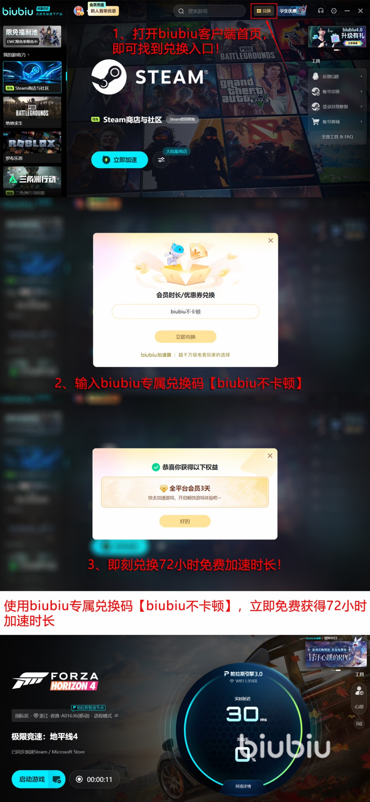选择biubiu的话,可以成为它的会员,在会员期间,可以畅享受加速器上所有的游戏,不仅仅是这款极限竞速地平线4这款游戏,还有很多其他客户端上的游戏,就连主机端的游戏也有很多。在启动加速前先来领下加速福利。新注册的直接拥有24h加速,新老用户用【biubu不卡顿】还能领到3天的加速。