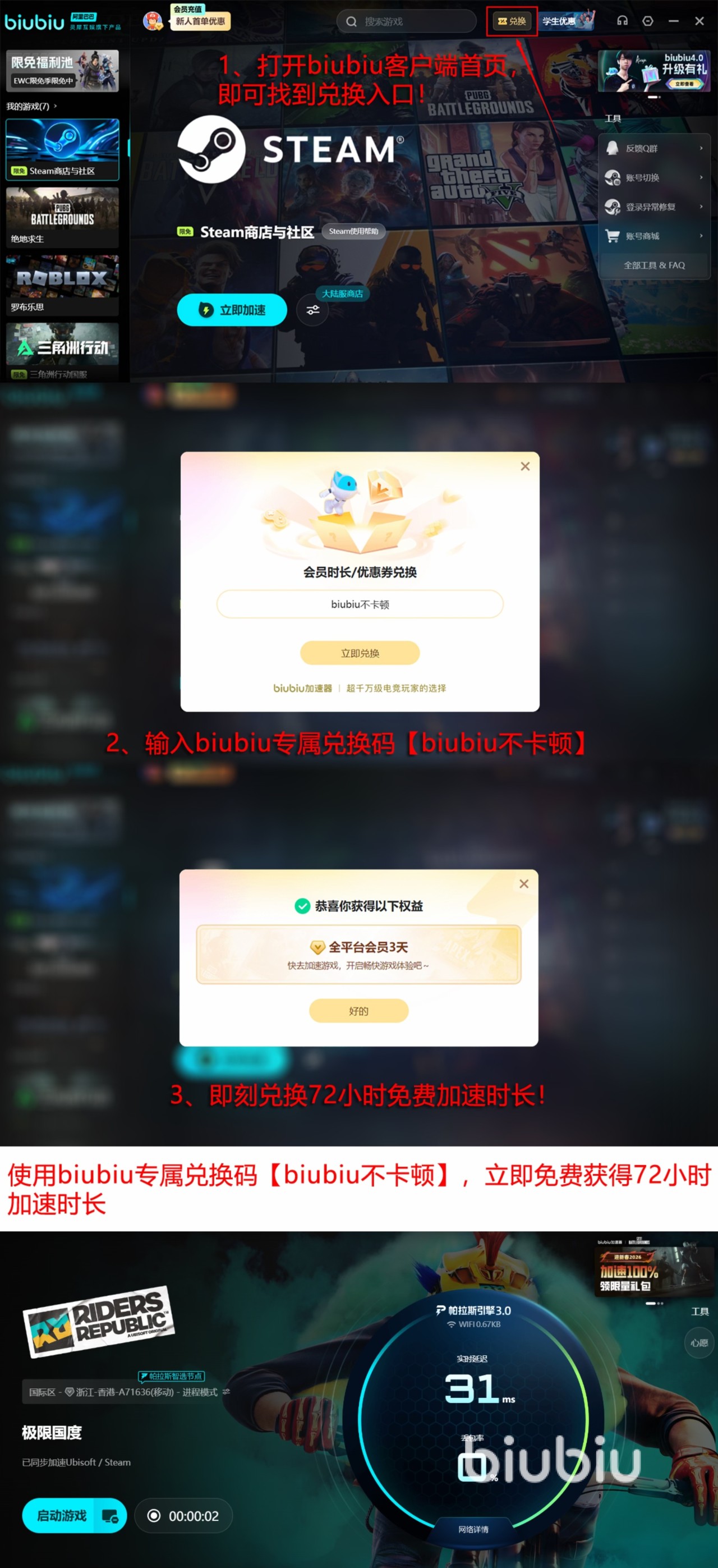 biubiu加速器凭借其高效的加速性能,获得了很多玩家的认可,要是对加速器感兴趣的话可以点击链接来下载。加速器还为注册用户们推出了丰富的福利活动,刚刚注册的新用户直接解锁24h的免费加速。新老用户都可以用【biubiu不卡顿】这个密令来加速器上成功领取到3天的加速。