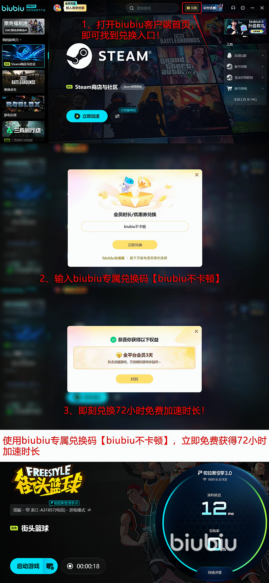 而且新人注册即可立即开通24小时免费加速,覆盖全场游戏不限类型,同时所有用户输入兑换码【biubiu不卡顿】还能额外叠加3天免费加速时长,其中新用户可以领取96小时的加速,专注享受游戏乐趣。