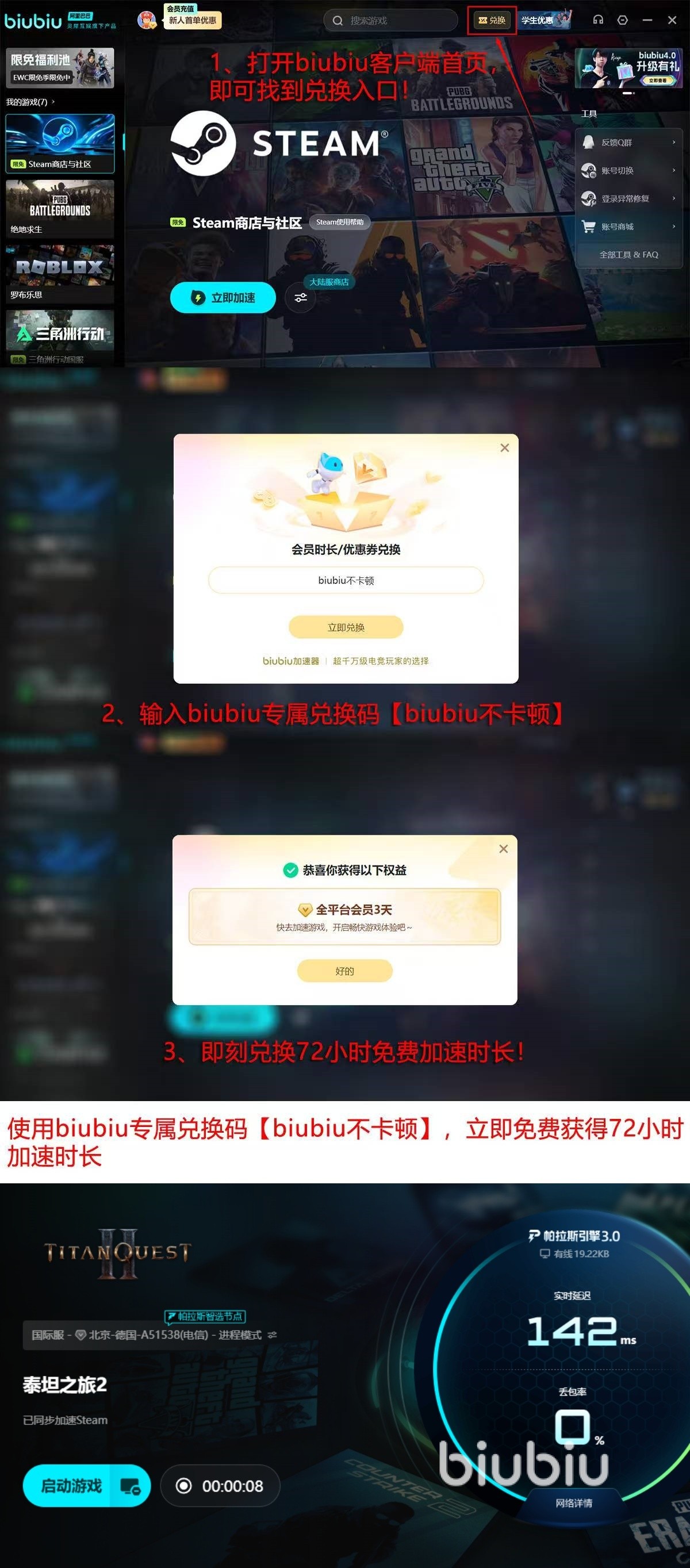 现在新用户在第一次使用这款软件的时候可以获取到24小时的免费加速,大家如果使用兑换码【biubiu不卡顿】的话,还能额外的获取到3天的免费加速时长。