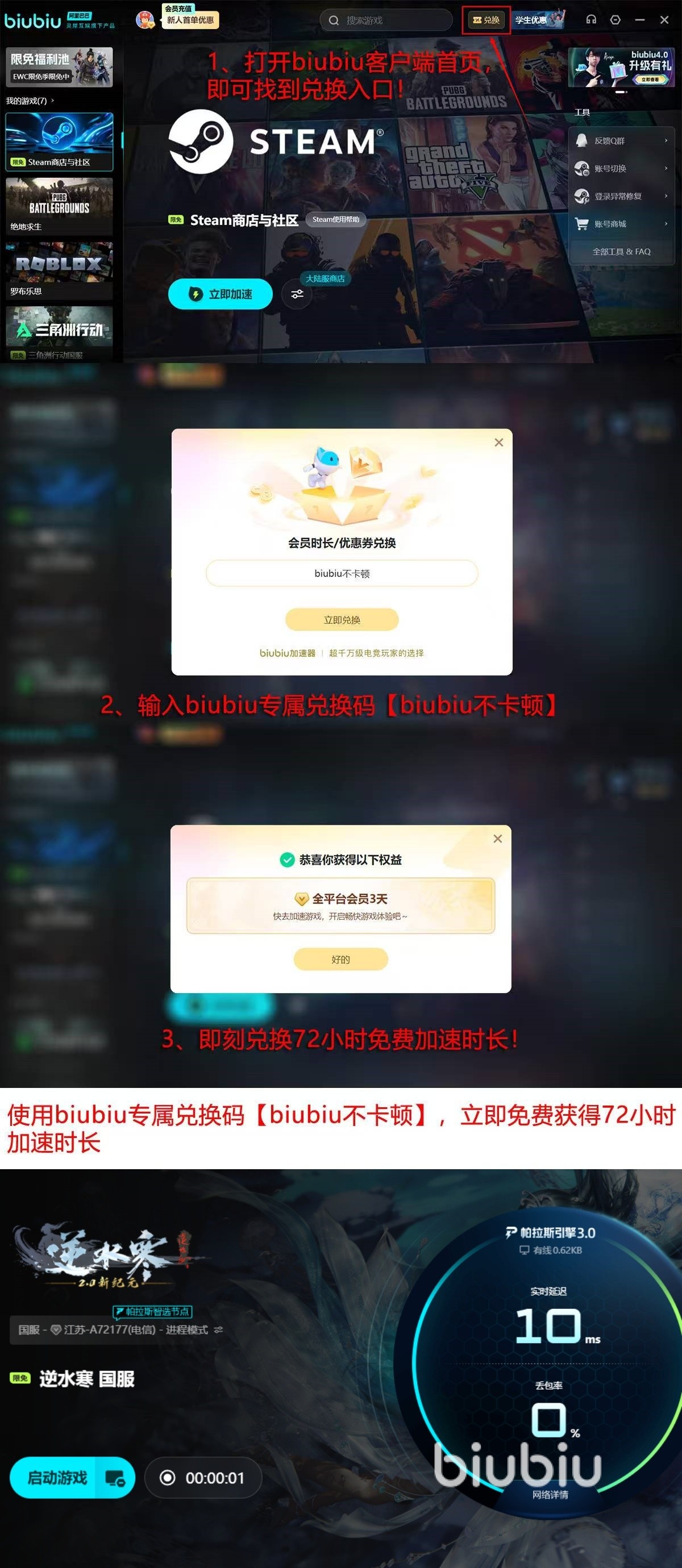 现在的新用户在第一次登录程序的时候便可以领取到游戏的福利。我们可以享受24小时的免费加速时间。如果觉得不够的话,使用兑换码【biubiu不卡顿】还能够额外的获取到3天的免费加速。