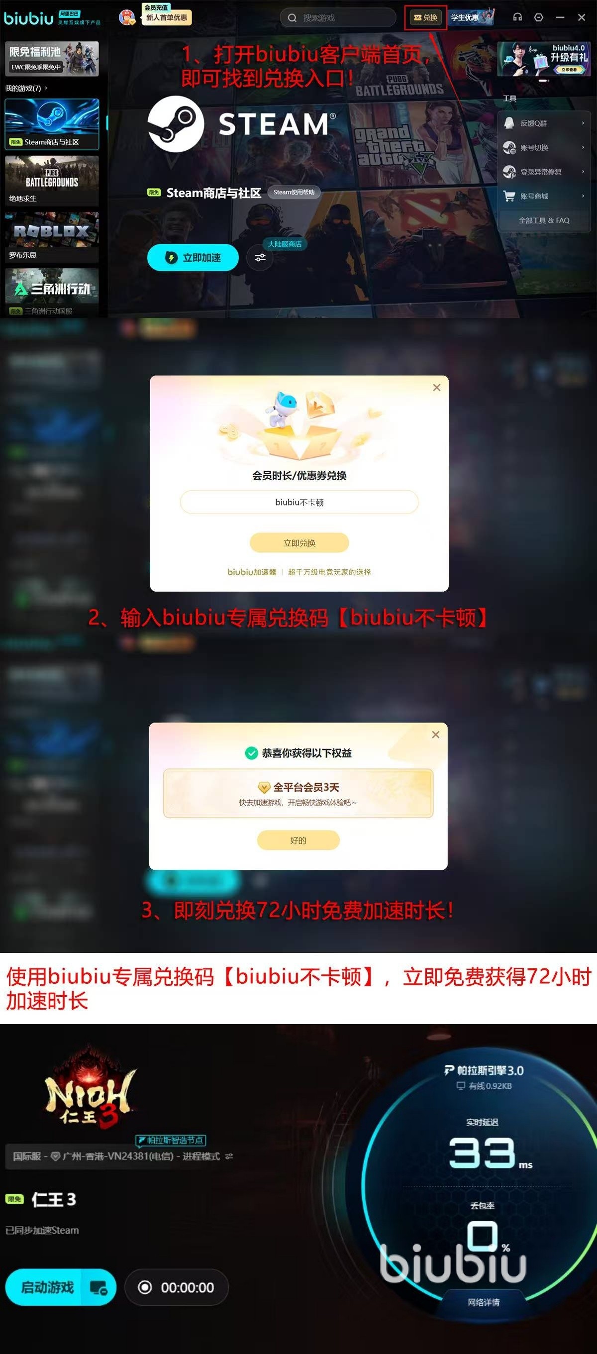 而且现在用biubiu还有两大福利,首先新人只要注册就会赠送24小时的免费体验时间,输入【biubiu不卡顿】的兑换码,还能额外再获得72小时,两者叠加能拿到整整96小时。