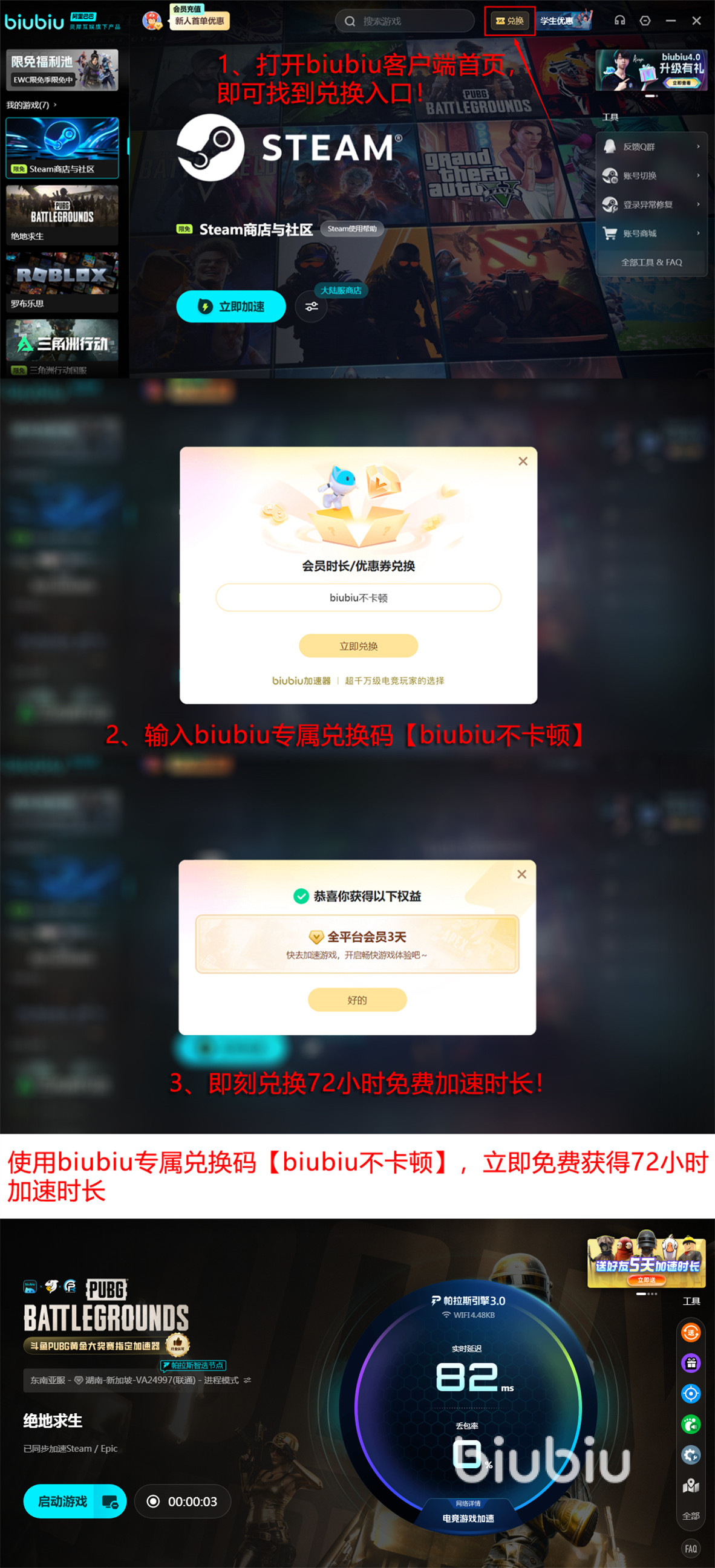 为了鼓励新用户放心的加入biubiu,现在推出了只要注册新号就能免费加速24小时的活动,这项长期活动长期有效欢迎大家随时加入。还有一个兑换码【biubiu不卡顿】,能兑换72小时免费加速时间,每个号都能用一次。这两项叠加起来,相当于给新人直接送了96小时超长免费加速时间,可真正做到放心试用。