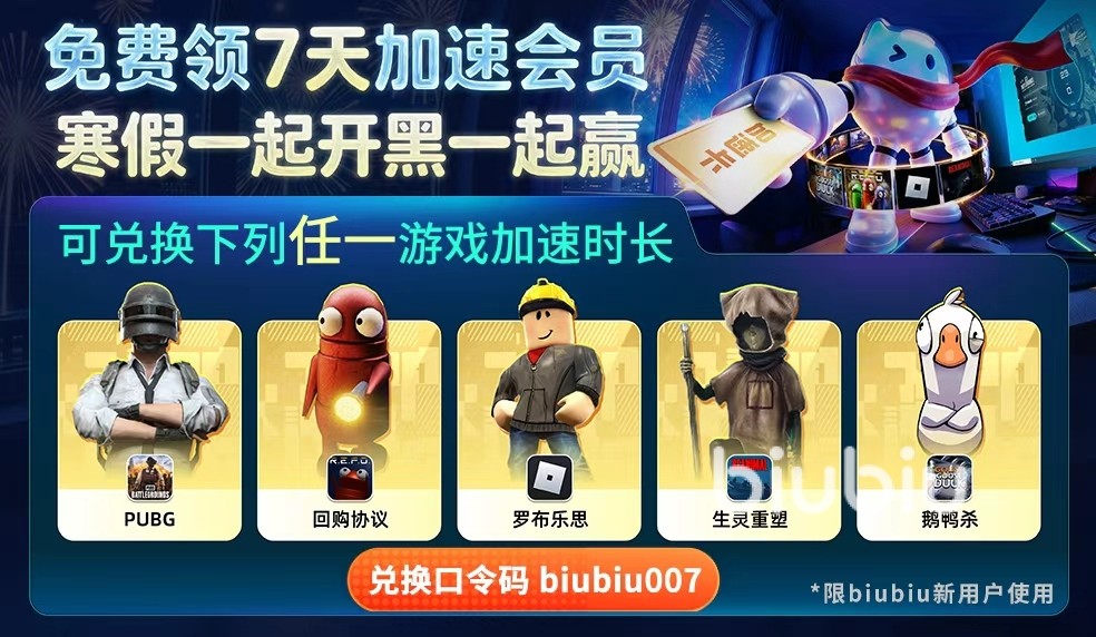 biubiu所带来的网络,除了普通玩家喜欢,职业选手一样爱用,前期刚在世界大赛上获得冠军的pubg职业选手小叮当,就常用biubiu加速器登录各服进行切磋,对效果非常认可。现其作为biubiu产品体验官,通过参赛和日常训练来帮助biubiu提升性能,近期大家观看pero战队比赛,还能看到pero展示biubiu加速器的战斗风采,这是因为战队将biubiu作为指定工具。2026寒假将至,要体验biubiu对pubg加速效果,从2月10日开始到3月9日结束,可对包括PUBG在内的五款游戏(回购协议、鹅鸭杀、罗布乐思、生灵重塑),使用口令【biubiu007】在客户端上“兑换”7天免费,可在这5款游戏中选一款加速7天。