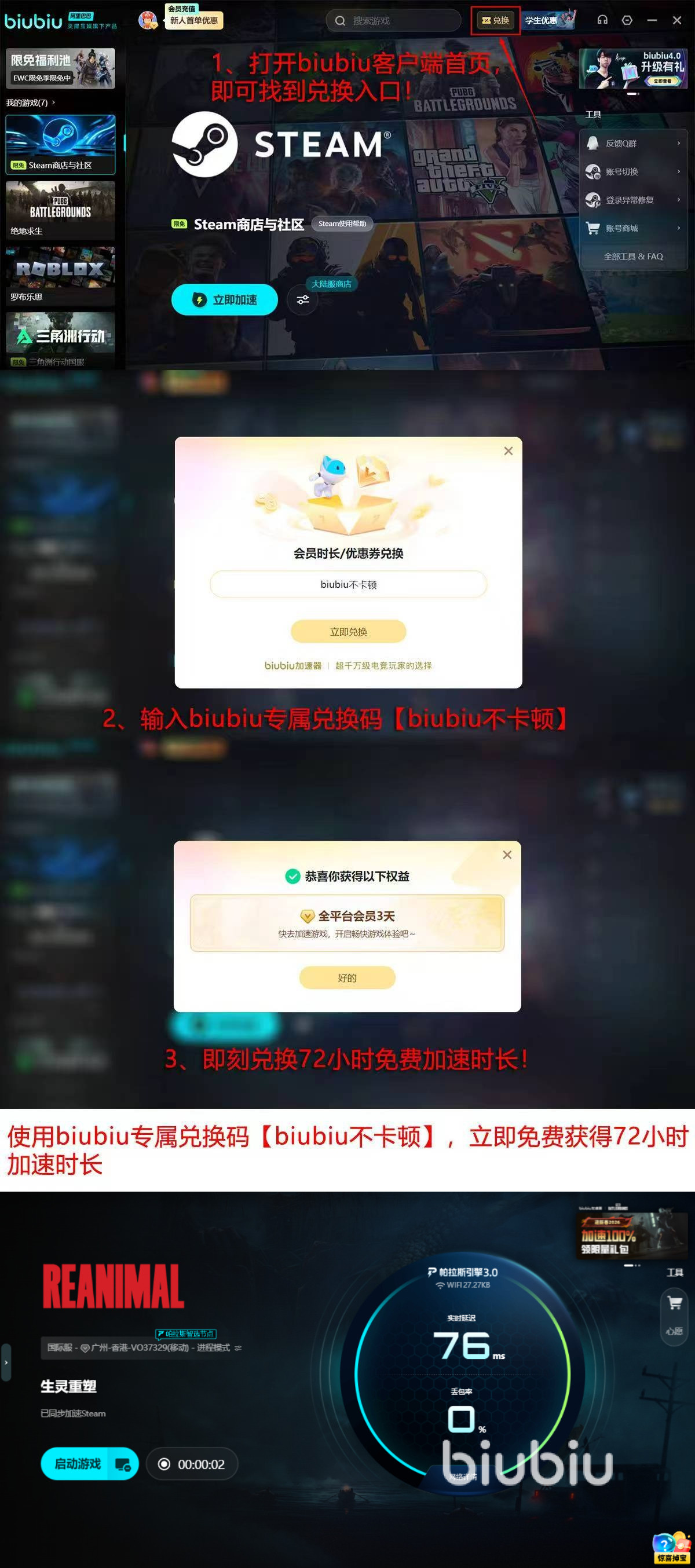 目前所有新用户注册成功之后,自动获得首日24小时全功能免费试用权限,输入【biubiu不卡顿】即可立即激活72小时加速权限,总计享受96小时免费加速体验,以上两个福利只能选择其中一项使用,不能叠加。