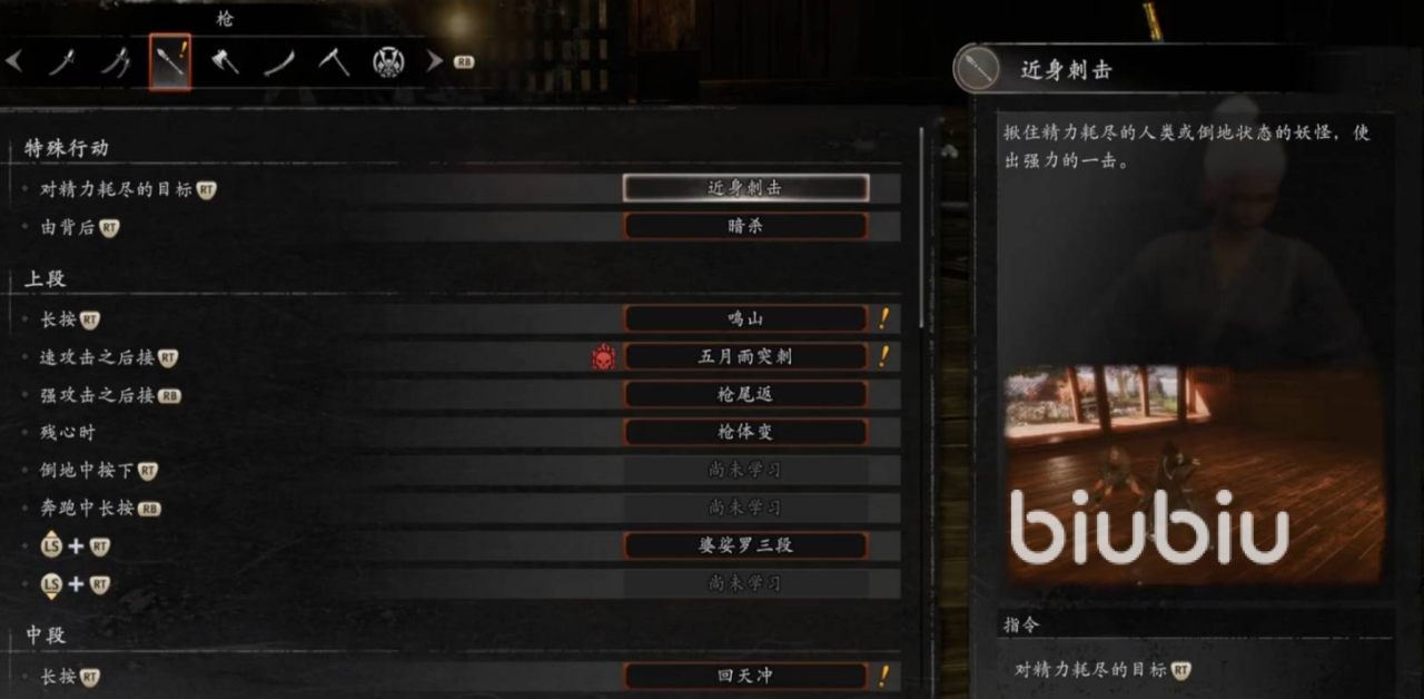 技能搭配要遵循武器的风格,和技能之间的联动,拿长枪来举例子,长枪的特定是灵活伤害,大家就可以为其搭配近身刺击和枪尾返,近身刺击可以对精力耗尽的人类,或是倒地状态的妖怪,打出强力一击,枪尾返能用枪尾迅速崩解敌人的姿势,这两招能相互配合形成压制流。