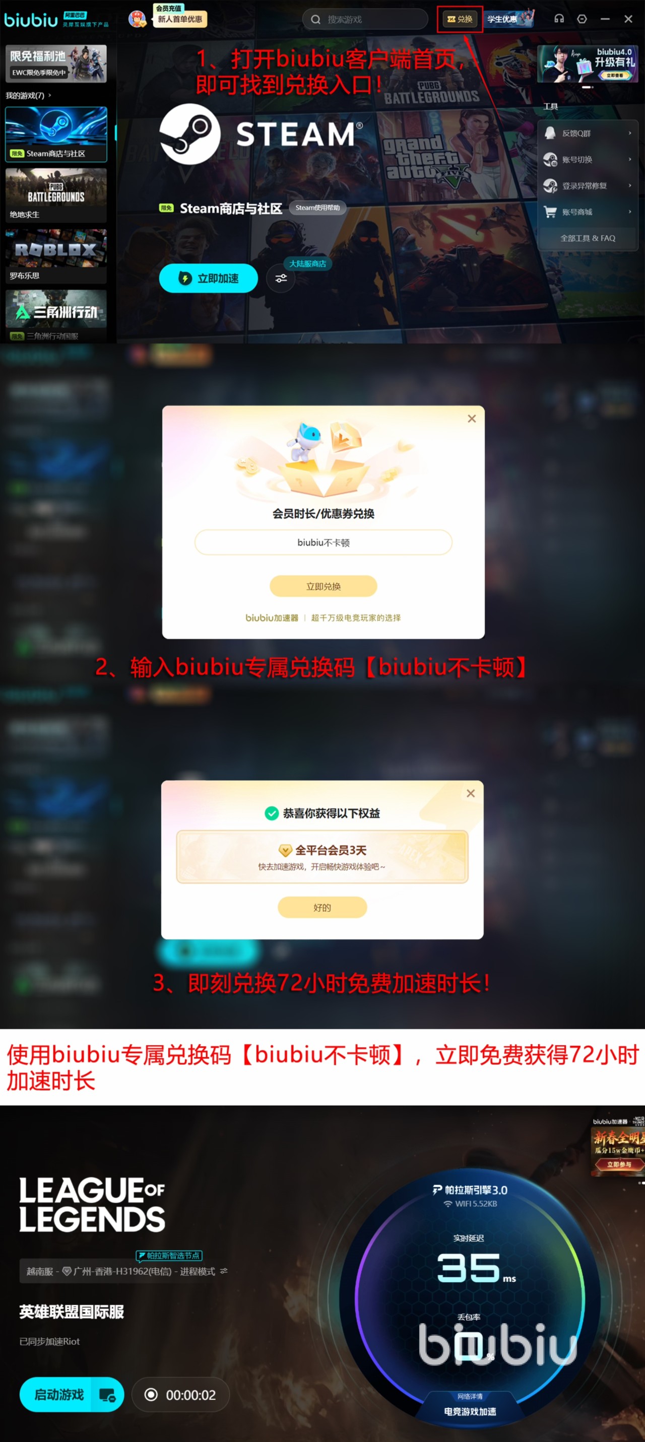 愿意来尝试下biubiu加速的话,就点击文中的链接来下载。如果玩家是第一次注册的话,注册完并登录后会直接解锁一份新人专享好礼,那就是直接获得了24h的加速时间,另外不管是新注册还是很久以前就注册过的用户,都可以用【biubiu不卡顿】这个口令来兑换到3天的加速,也就是说新注册可以最多拥有96h的免费加速。