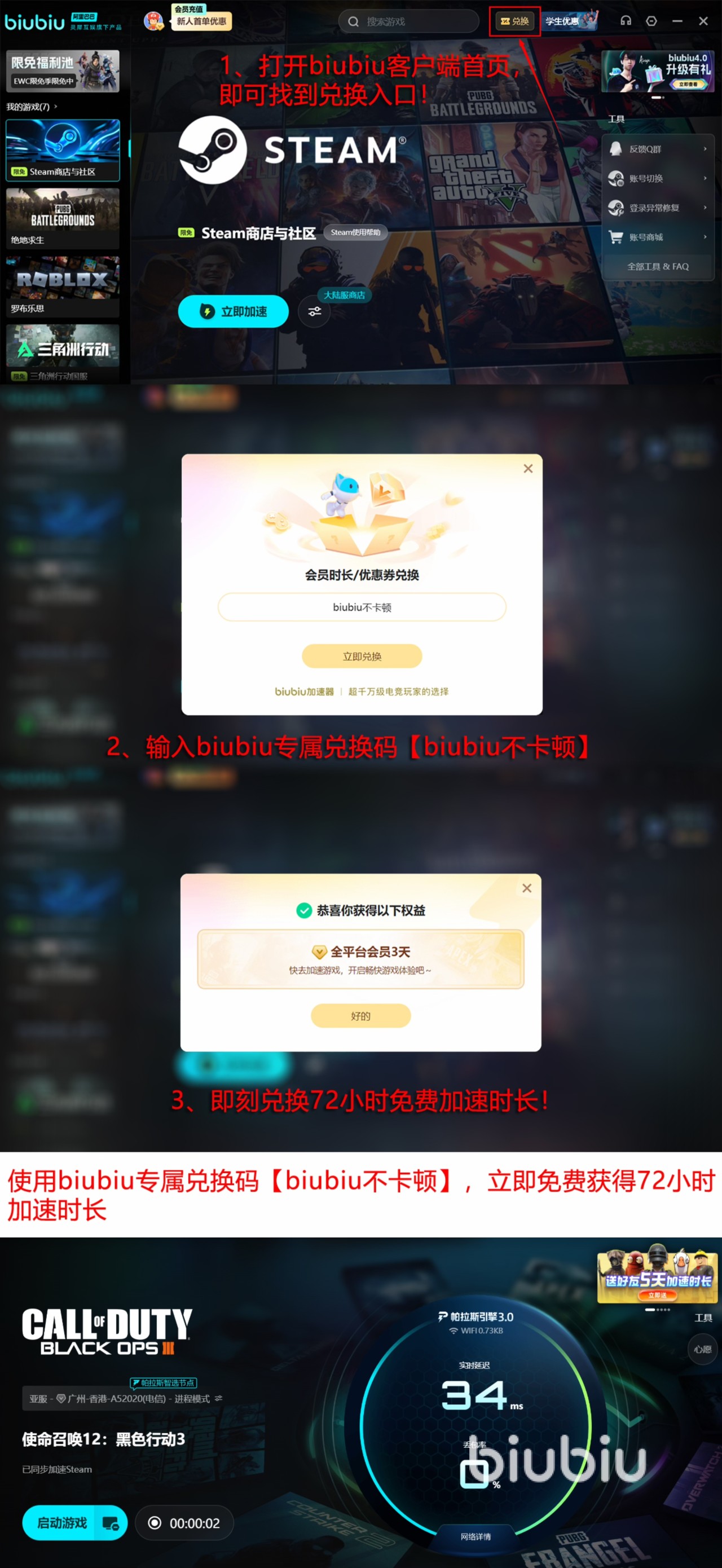 对于软件的评价,不能光只提到它的性能,服务也是很重要的内容。在biubiu上活动内容有很多,尤其是在加速福利上更是针对不用类型的用户有不同的优惠力度。新注册的用户直接解锁了24h的加速,新老用户用【biubiu不卡顿】能兑换到3天的加速。你要还再是在校大学生的话,用学信号解锁学生用户认证,还能享受一次超低折扣的充值活动,这样叠加下来,假期的时光就可以稳稳加速了。