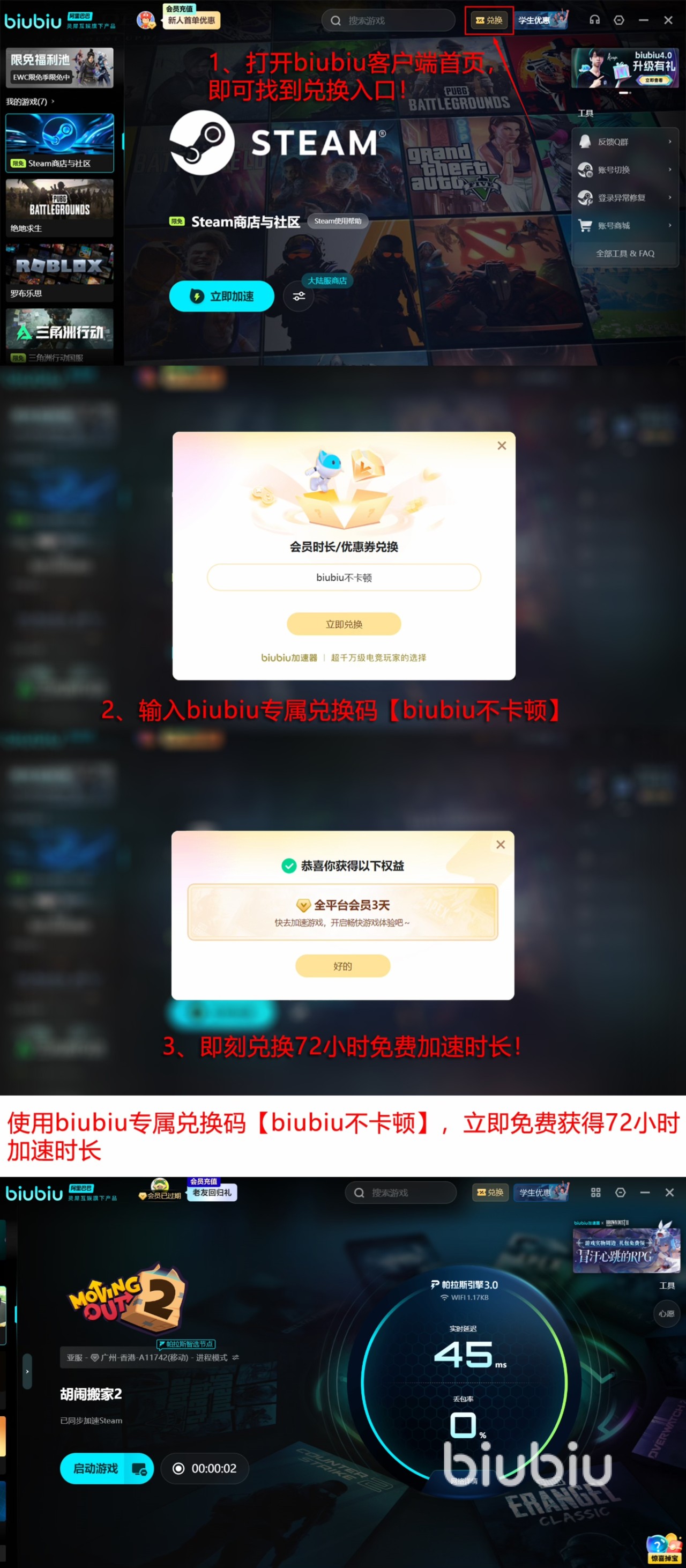 当然现在有很多朋友都从来没有用过加速器这种工具,这也就自然而然地对biubiu的真实效果产生了疑问。不用担心,为了彻底让朋友们用得放心,biubiu推出了新用户首次注册即可立马获得24小时体验的时间哦,另外还有【biubiu不卡顿】这个新老用户都可使用一次的兑换码来获得3天加速时间。