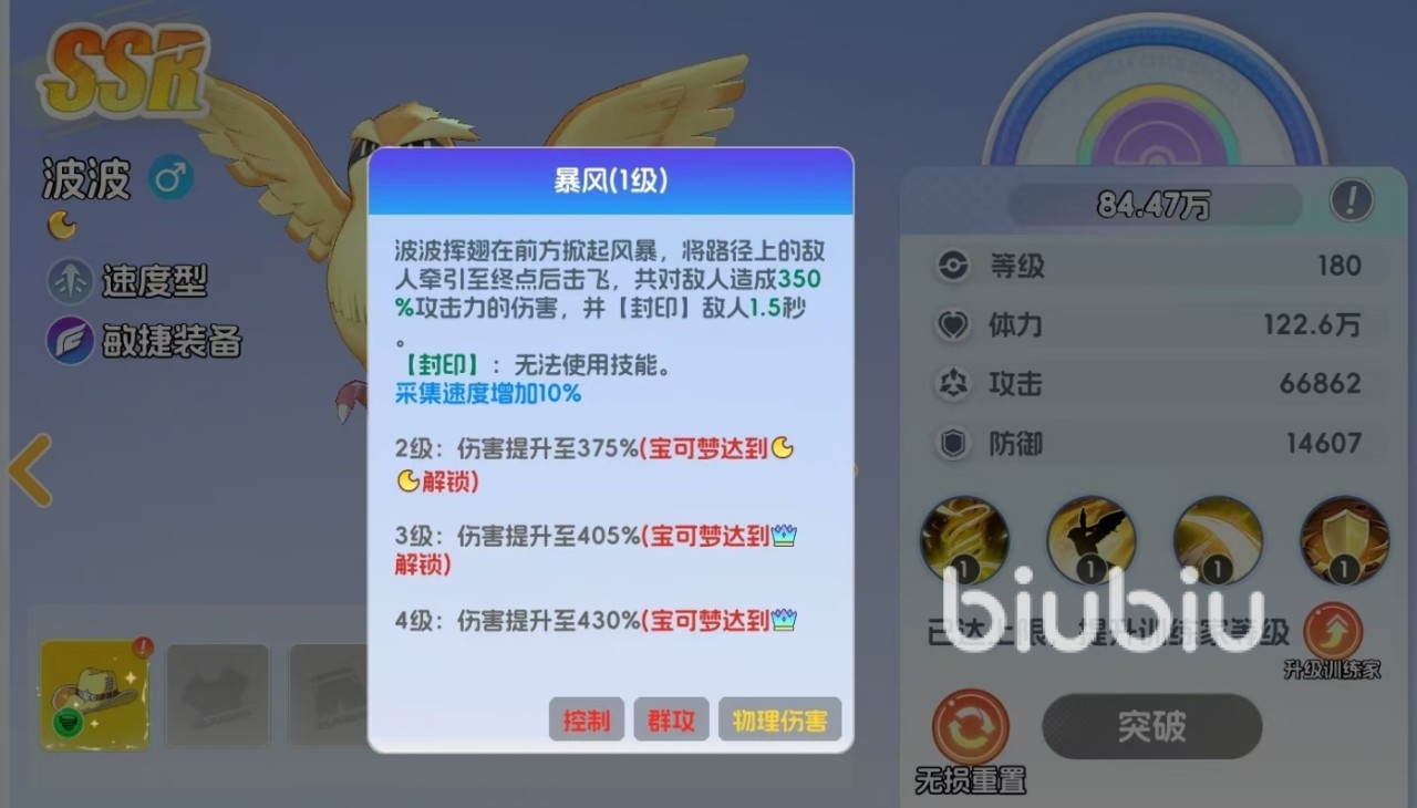 波波的基础属性倾向明确——主攻敏捷成长,战斗中以物理突袭为主要输出方式。其1级即可习得的主动技能“风暴突击”,不仅能对路径上所有敌人造成高额物理伤害,还附带击飞效果及持续2秒的技能封印,兼具清场与控场双重价值。11级解锁的“疾风突袭”使其可在战斗开局瞬间位移至敌方后排,实现精准打击;而41级开放的“空气斩”则进一步强化连段节奏,大幅提升对后排单位的瞬时压血能力。值得注意的是,当敌方后排部署以远程攻击为主的宝可梦时,波波将触发专属被动加成,额外提升自身攻击力,从而放大对脆皮输出位的压制效率。