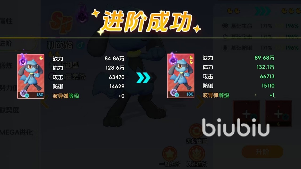 为适配不同操作习惯,游戏提供三种进阶模式:直接升阶(手动指定全部素材)、一键进阶(批量将所有金色品质宝可梦统一升至月亮1阶,用于激活进阶资格或转化为素材)、快速进阶(系统智能匹配可用素材与本体,在资源充足前提下支持跨多节点连续进阶)。三种模式各具适用场景,合理组合使用可大幅提升养成效率。