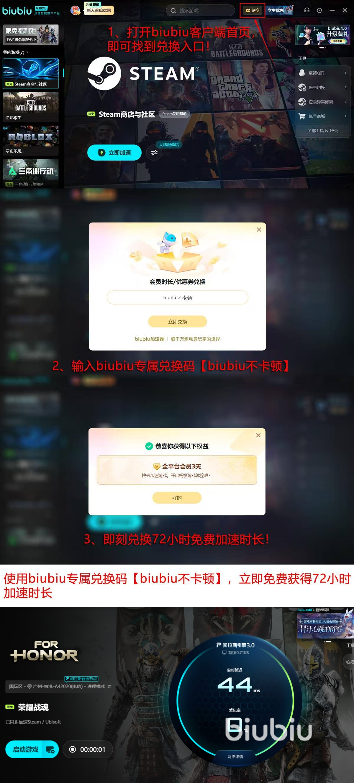 而除了加速效果好以外,加速器中还收录了市面上能见到的几乎所有的热门游戏,并且提供了多节点、区服供大家进行加速,可以让大家畅玩市面上所有需要加速器的游戏都能有好的游戏体验,还有福利活动给到大家,只需搜索【biubiu不卡顿】兑换码那就可以领取到72小时的免费加速时长,在这个基础上如果还是新用户的话,那么还可以再领取到24小时的免费加速时长,算下来一共就是96小时的免费加速时间,这就是推荐这加速器的理由了。