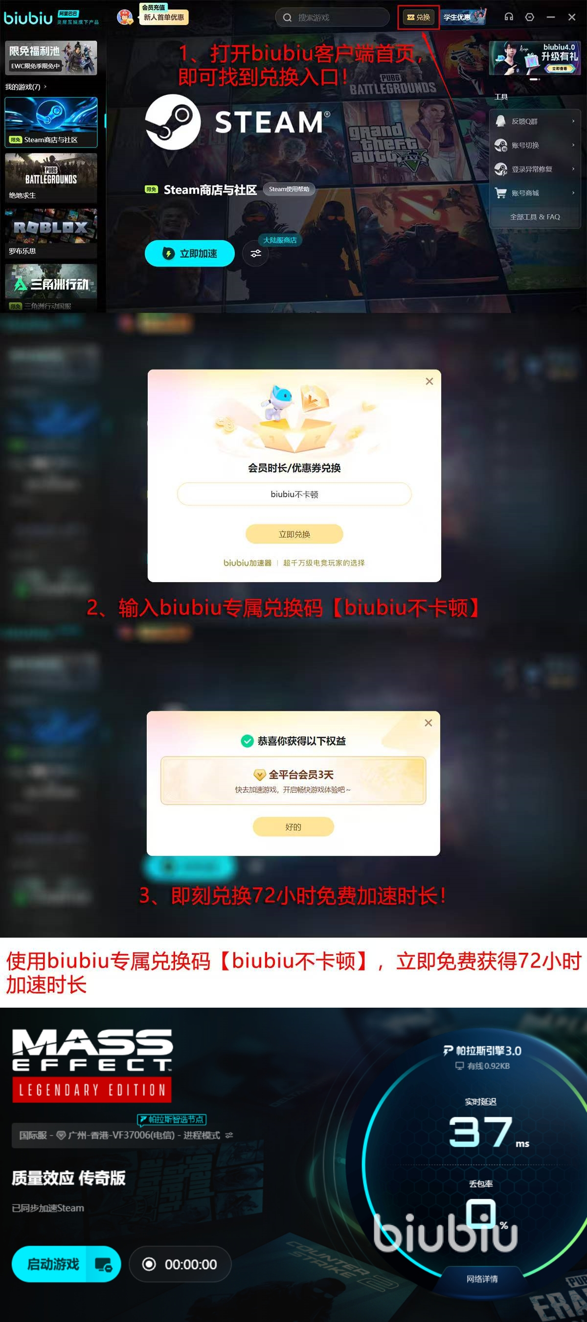 此外除了加速效果一流外,这加速器上还收录着市面上能看到的几乎所有的热门游戏,这意味着后续如果还有其它游戏的加速需求的话,也能够在这款加速器上进行完成,还可以自由选择区服节点来加速,这么多游戏量放在众多加速器中也是相当的恐怖的了,最后是福利活动拥有一个【biubiu兑换码】兑换72小时免费加速时长和新用户注册领取24小时免费加速时长的福利活动,总计一共可以拿到96小时的免费试用时间,这个福利力度放在加速器中也是独一档的存在。