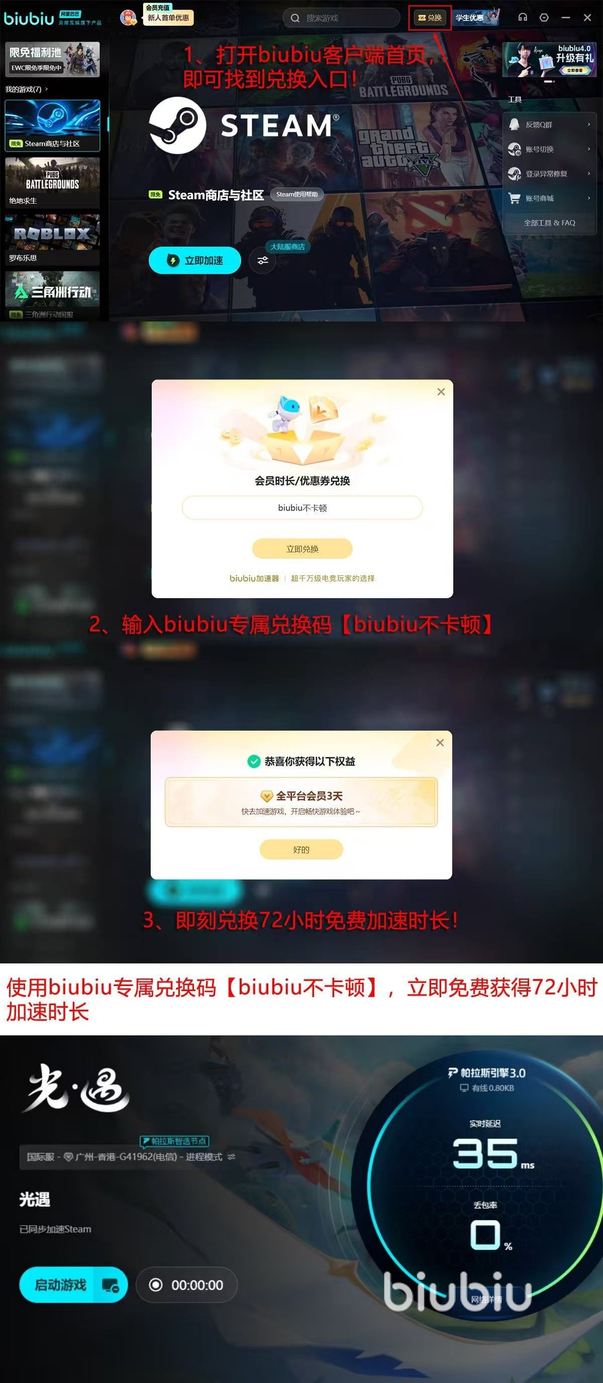 biubiu的操作还非常简单,它有着“一键加速”功能,大家不需要复杂的设置,只需要找到光遇后,轻松点击启动按钮,就可以帮助加速,而且现在用还有额外福利,新人只要注册登录,就会赠送24小时的免费加速时间,如果在兑换界面将【biubiu不卡顿】给输入,还能再获得72小时,两者合计加在一块总共会有96小时,足够大家尽情体验感受加速效果。