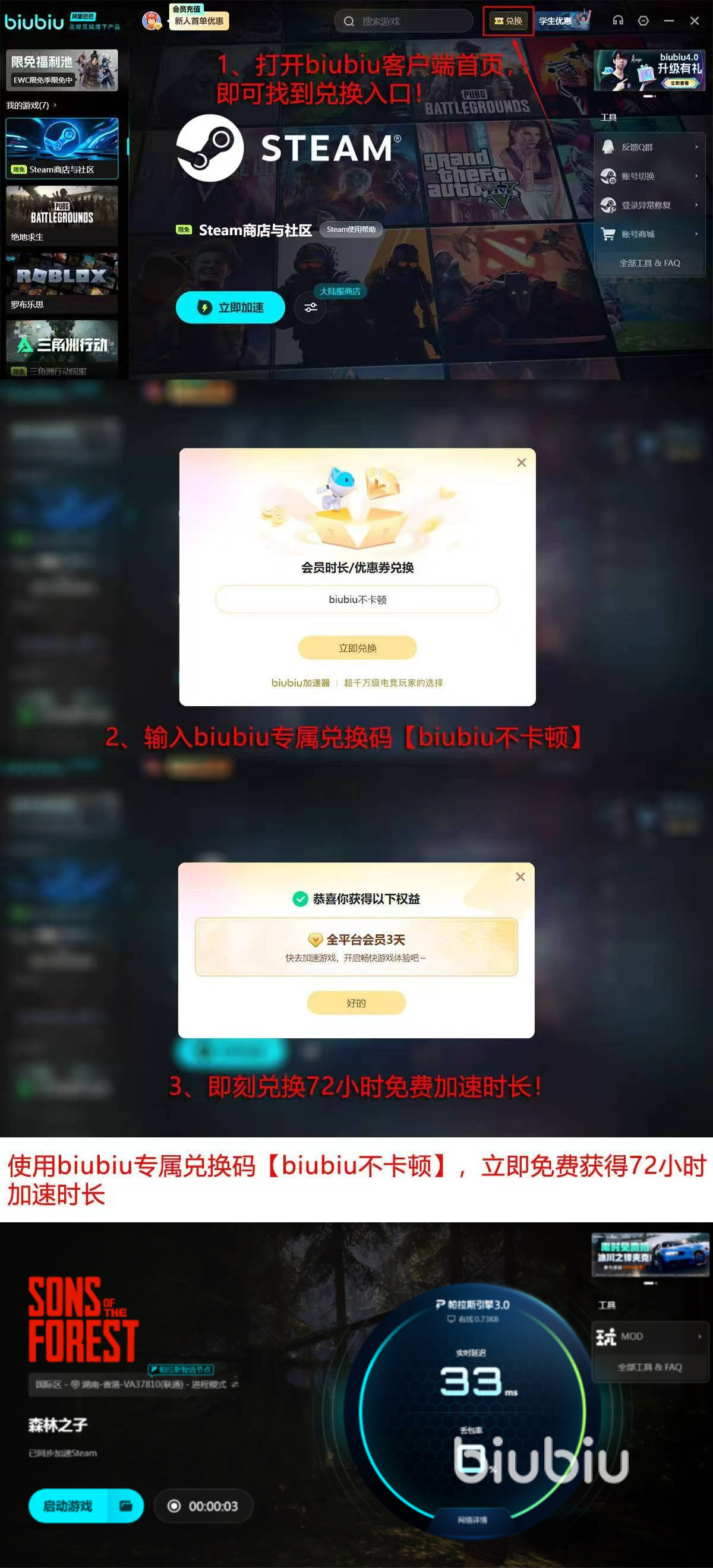 惊喜福利让玩家无忧启程,新用户注册biubiu加速器后立即获得首日24小时全功能免费试用,输入【biubiu不卡顿】可以额外获得72小时免费时长,两个福利叠加起来的新用户可以享受到四天的顶级游戏加速服务,充分体验出稳定的网络环境下所具有的极致魅力。