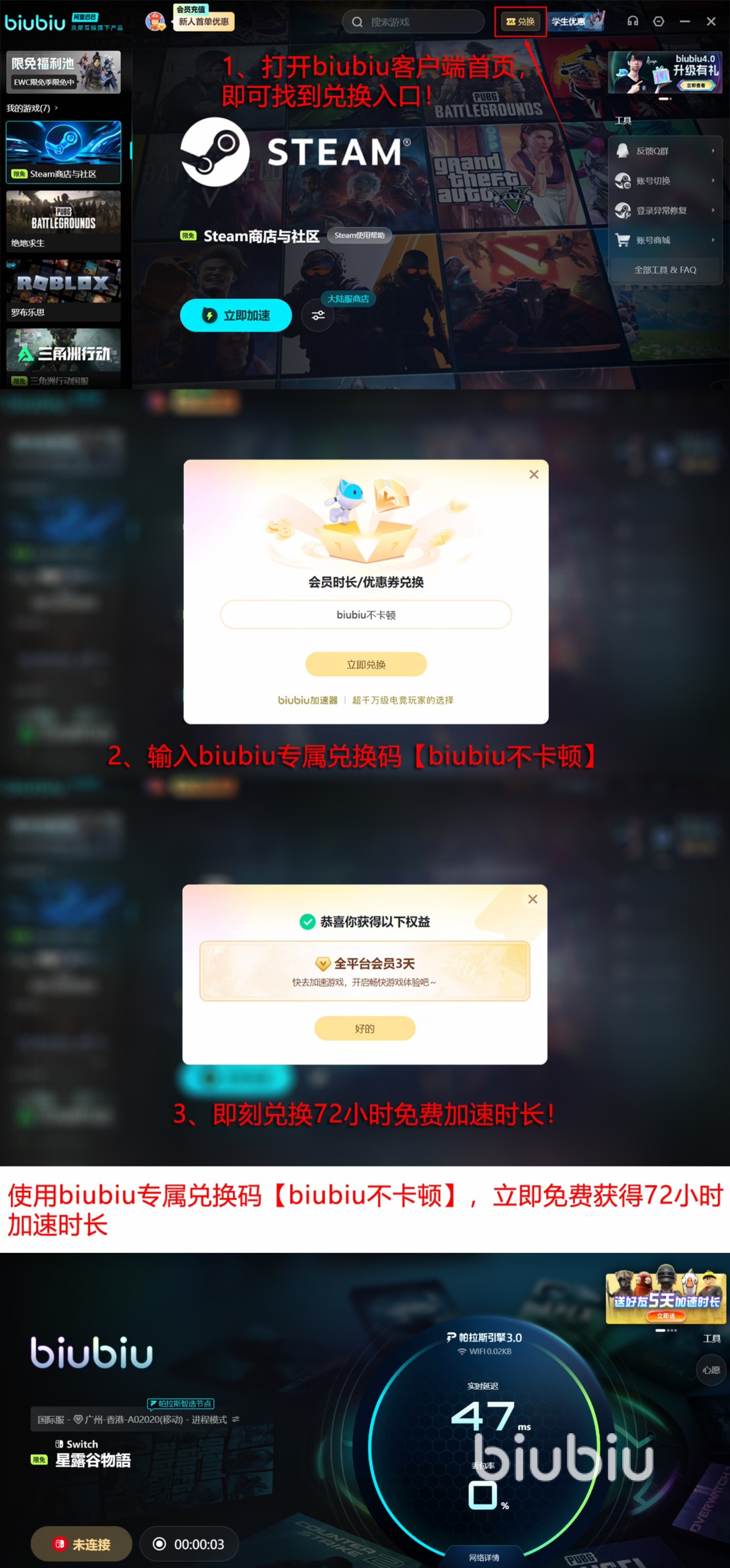 这款加速器的优势也不止在于加速性能上,它相关的加速福利做的也很到位。为了弥补人工客服在线时间不是24小时的设定,引入了智能机器人客服,也就是我们可爱的biu仔,有什么问题直接问它就好了。加速器上还有很多的白嫖福利,新人用户直接解锁24h加速,新老用户用【biubiu不卡顿】可以兑换到的3天加速等。