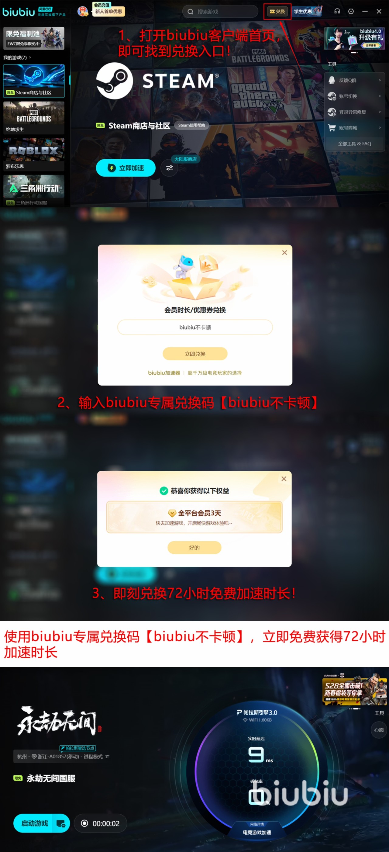 对首次注册的用户,加速器上还有专门的加速福利,在登陆后能直接解锁24h的免费加速,也就是拥有了加速器上一天的免费体验时间。在这个时间内,玩家不仅能对这款游戏进行加速,也能对加速器上的其他游戏进行加速。如果想要尝试其他游戏的,这个24小时可能不够,那只要是加速器上的注册用户,还可以用【biubiu不卡顿】这个口令,领取到3天时间的加速,这个时间足够玩家好好体验下biubiu的加速了。