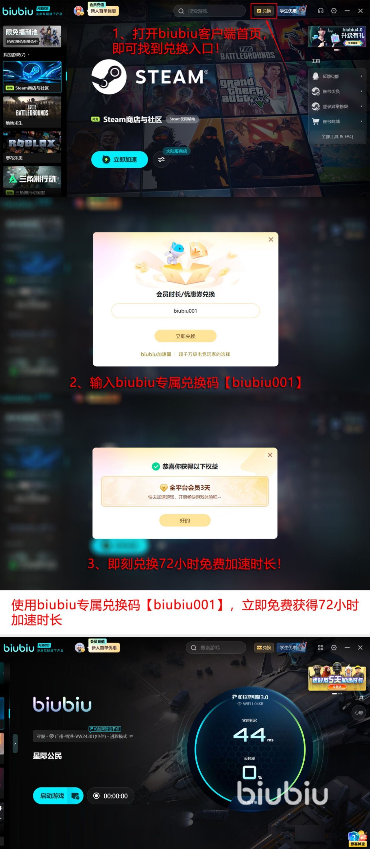 凭借很多优势,早已得到了pubg冠军小叮当的大力推荐。覆盖场景比较多,任意的都可以在这里轻松寻找,已经覆盖上万款。在操作的过程中更不需要担心,并没有复杂的流程,反而通过搜索以及一键加速就可畅通无阻。创作时致力于为大家带来更好的收益效果,因此还提供了很多免费的权利以及特权,免费使用的时间长达96小时,大家只要输入【biubiu001】就能立即拥有三天的免费特权,新人首次注册的话,也可立即获得24小时。