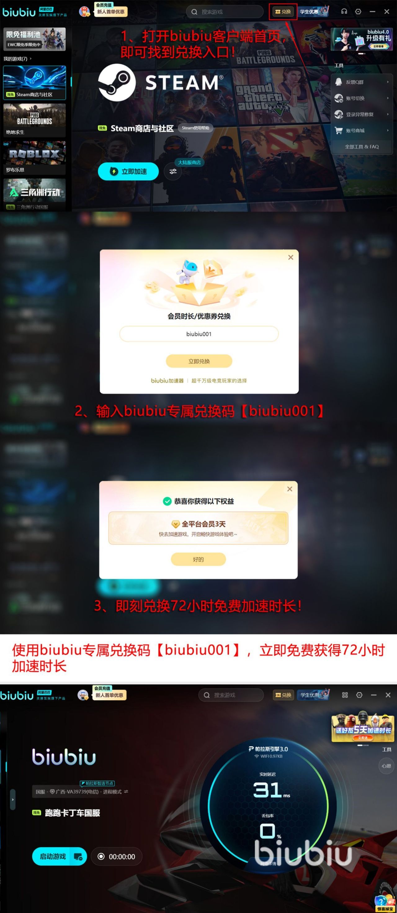 如果你想试用的话,那么可直接下载,首次注册拥有开放限时福利,完成账号激活,即可获得24小时全加速权限,使用口令【biubiu001】并即可额外获得72小时免费加速时长,这个活动所有新老用户全部都可参与,然新用户能够累积96小时,相当于4日无忧体验。